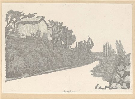 Lot 523 Giorgio Morandi, Bologna 1890 - 1964, La strada bianca, 1933, Acquaforte su zinco, su carta India incollata, es. 34/50, cm. 20,6x30,1 (lastra), cm. 33,8x42,4 (carta) Firma e data in lastra in basso al centro: Morandi 1933, firma a matita sul margine in basso a destra: Morandi, tiratura in basso a sinistra: 34/50. Primo stato su due, tiratura di 50 esemplari, di cui alcuni su carta India incollata, e una prova di stampa. Bibliografia, Lamberto Vitali, L'opera grafica di Giorgio Morandi, Giulio Einaudi Editore, Torino, 1964, n. 104;, Michele Cordaro, Morandi incisioni. Catalogo Generale, Edizioni Electa, Milano, 1991, p. 118, n. 1933 6.