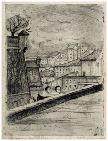 Lot 2 RAOUL DAL MOLIN FERENZONA Firenze 1879 – Milano 1946 Livorno Acquaforte es.1/30. Firma in b. a d.; località + scritta “OP. 372” in b. a s.; monogramma “R.D.M.F.” sulla lastra in b. a d.; sul catone di chiusura scheda fotocopiata dell’artista. (18,2 x 14 foglio – 16,8 x 12,8 inc.) B.A.: 50