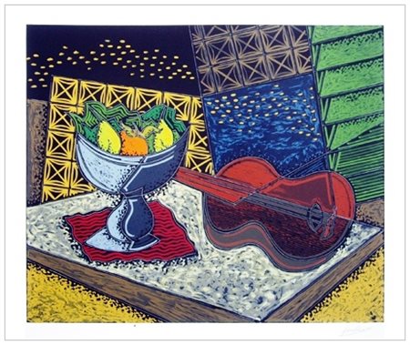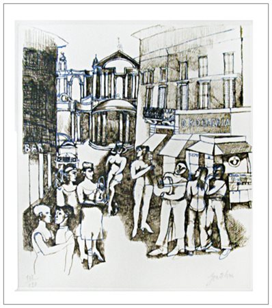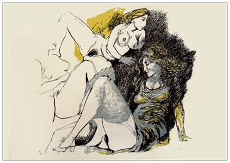Lot 6 RENATO GUTTUSO Bagheria 1912 – Roma 1987 Senza titolo Litografia a colori es.71/75. Firma in b. a d. (49,8 x 70,6 foglio – 45 x 50 lito.) B.A.: 190