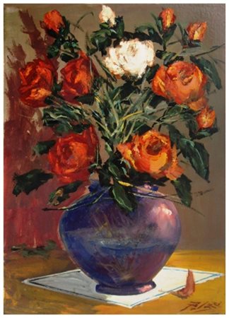 Lot 21 LORENZO PALAZZI Livorno 1921 – Livorno 1990 Rose 1960 Olio su faesite 70 x 50. Firma in b. a d.; sul verso data, titolo, firma, tecnica e misure + etichetta dell’artista + Certificato e autenticità Casa d’Arte Toscana, Livorno. B.A.: 100