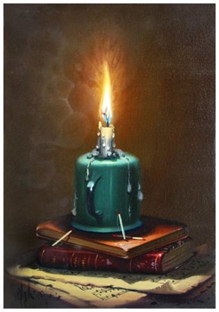 Lot 24 MARIO UGHI Livorno 1932 – Livorno 2012 A lume di candela Olio su tela 50 x 35. Firma in b. a s.; sul verso titolo, firma e località + scritta dell’artista.