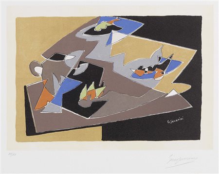 Lot 1 Gino Severini, Cortona (Ar) 1883 - Parigi 1966, Natura morta - Composizione, 1964-65, Litografia a colori, es. 22/85, cm. 20,8x29,7 (lastra), cm. 36,7x49,6 (carta), Firma a matita su margine in basso a destra: Gino Severini, tiratura in basso a sinistra: 22/85., Certificato Il Bisonte, Firenze., Tiratura di 85 esemplari in numeri arabi, 25 in numeri romani e alcune prove d'artista; stampatore Rodolfo Margheri, Firenze, editore Il Bisonte, Firenze, 1965., Bibliografia: Francesco Meloni, Gino Severini. Tutta l'opera grafica, Libreria Prandi, Reggio Emilia, 1982, pp. 114, 115, n. 49.