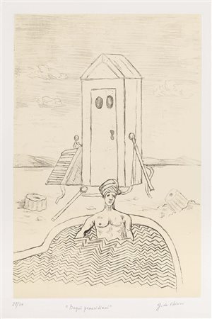 Lot 2 Giorgio de Chirico, Volos 1888 - Roma 1978, Bagni pomeridiani, 1972, Incisione a vernice molle, es. 23/70, cm. 47,3x31,7 (lastra), cm. 70x47,8 (carta), Firma a matita sul margine in basso a destra: G. de Chirico, tiratura in basso a sinistra: 23/70, titolo in basso al centro: "Bagni pomeridiani", timbri a secco GdeC e Alberto Caprini Stampatore in Roma. Al verso: certificato di garanzia Edizioni Bora., Tiratura di 70 esemplari in numeri arabi, 25 in numeri romani e 12 prove d'artista., Bibliografia: Edoardo Brandani, Giorgio de Chirico. Catalogo dell'opera grafica 1969-1977, Edizioni Bora, Bologna, 1990, p. 32, n. 19.