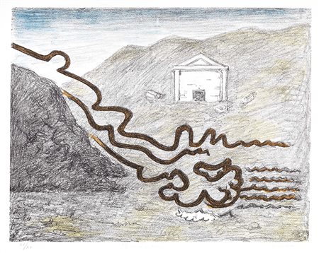 Lot 9 Giorgio de Chirico, Volos 1888 - Roma 1978, Il fiume misterioso, 1969, Litografia a colori, es. XV/XX, cm. 48,5x56 (lastra), cm. 50,3x70 (carta), Firma a matita sul margine in basso a destra: G. de Chirico, tiratura in basso a sinistra: XV/XX, titolo in basso al centro: "Il fiume misterioso", timbri a secco GdeC e Alberto Caprini Stampatore in Roma. Al verso: certificato di garanzia Edizioni Bora., Tiratura di 90 esemplari in numeri arabi, 20 in numeri romani e 12 prove d'artista., Bibliografia: Edoardo Brandani, Giorgio de Chirico. Catalogo dell'opera grafica 1969-1977, Edizioni Bora, Bologna, 1990, p. 66, n. 49.,