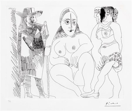 Lot 10 Pablo Picasso, Malaga 1881 - Mougins 1973, Senza titolo, 1970, Acquaforte, es. 32/50, cm. 27,2x34,5 (lastra), cm. 41,5x47,2 (carta), Firma a timbro sul margine in basso a destra: Picasso, tiratura a matita in basso a sinistra: 32/50, data in lastra in alto a sinistra: 22.5.70 (speculare)., Certificato su foto Galerie Louise Leiris, Parigi, 6 aprile 1979, con n. 15648/64442., Tiratura di 50 esemplari in numeri arabi e 15 prove d'artista in numeri romani., Bibliografia: Georges Bloch, Pablo Picasso. Tome IV Catalogue de l'oeuvre gravé et lithographié 1970-1972, Suppléments tome I + II, Kornfeld et Klipstein, Berne, 1979, p. 86, n. 1908.,