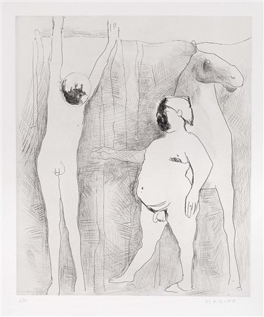 Lot 11 Marino Marini, Pistoia 1901 - Viareggio (Lu) 1980, L'impiccato, 1946, Acquaforte, es. 4/90, cm. 40x33,2 (lastra), cm. 65x50,5 (carta), Firma a matita sul margine in basso a destra: Marino, tiratura in basso a sinistra: 4/90: timbro a secco Graphis Arte, Livorno., Tiratura di 90 esemplari in numeri arabi; stampatore Fratelli Crommelynck, Parigi, editore Vertice Editoriale d'Arte, Livorno, 1977., Bibliografia: Guido Guastalla, Giorgio Guastalla, Marino Marini. Catalogo ragionato dell'Opera grafica (Incisioni e Litografie) 1919-1980, Edizioni Graphis Arte, Livorno, 1990, p. 201, n. A26.,