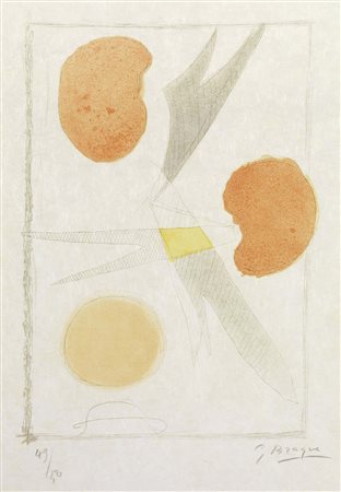 Lot 12 Georges Braque, Argenteuil 1882 - Parigi 1963, La Liberté del mers, 1959, Libro d'artista con quattro litografie a colori fuori testo, es. 49/50, cm. 56x38 ca., Libro con firme di G. Braque e P. Reverdy, litografie con firma in basso a destra: G. Braque e tiratura in basso a sinistra: 49/50., Storia: Collezione Renato Giani, Montecatini Terme; Collezione privata, Libro di Paul Reverdy con all'interno 7 litografie a colori e 60 decori in nero e colore di Georges Braque., Tiratura di 50 esemplari su carta Montval e 200 esemplari su carta Arches. Gli esemplari su Montval sono accompagnati da una serie speciale di 4 litografie a colori su carta Giappone., Editore Maeght, stampatore Mourlot, Parigi., Bibliografia: Dora Vallier, Braque. L'oeuvre gravé, catalogue raisonné, Flammarion, Parigi, 1982, pp. 204-11, n. 143.,