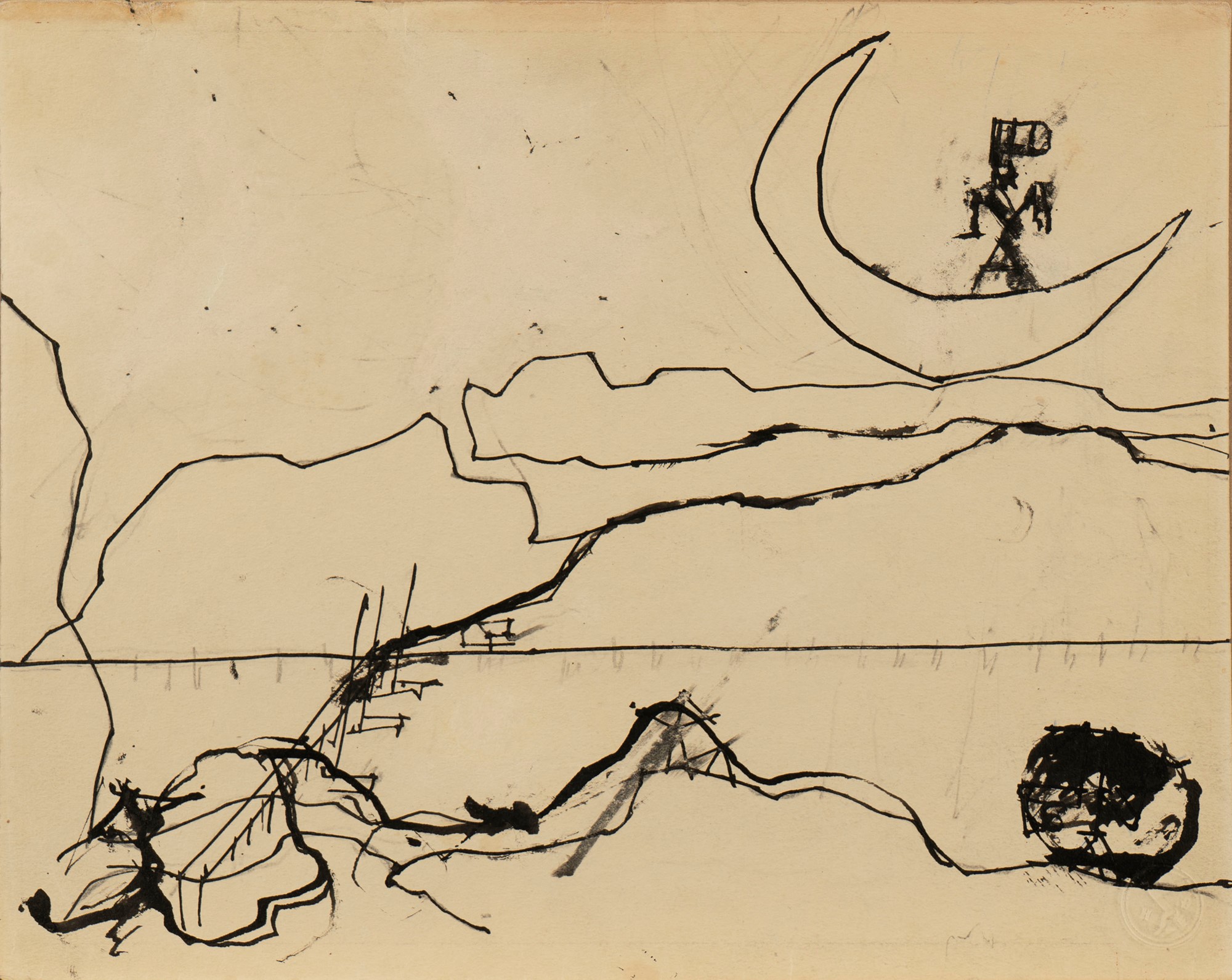 Osvaldo Licini (Monte Vidon Corrado 1894-1958) - Senza titolo (Luna con barone di Munchausen), 1955