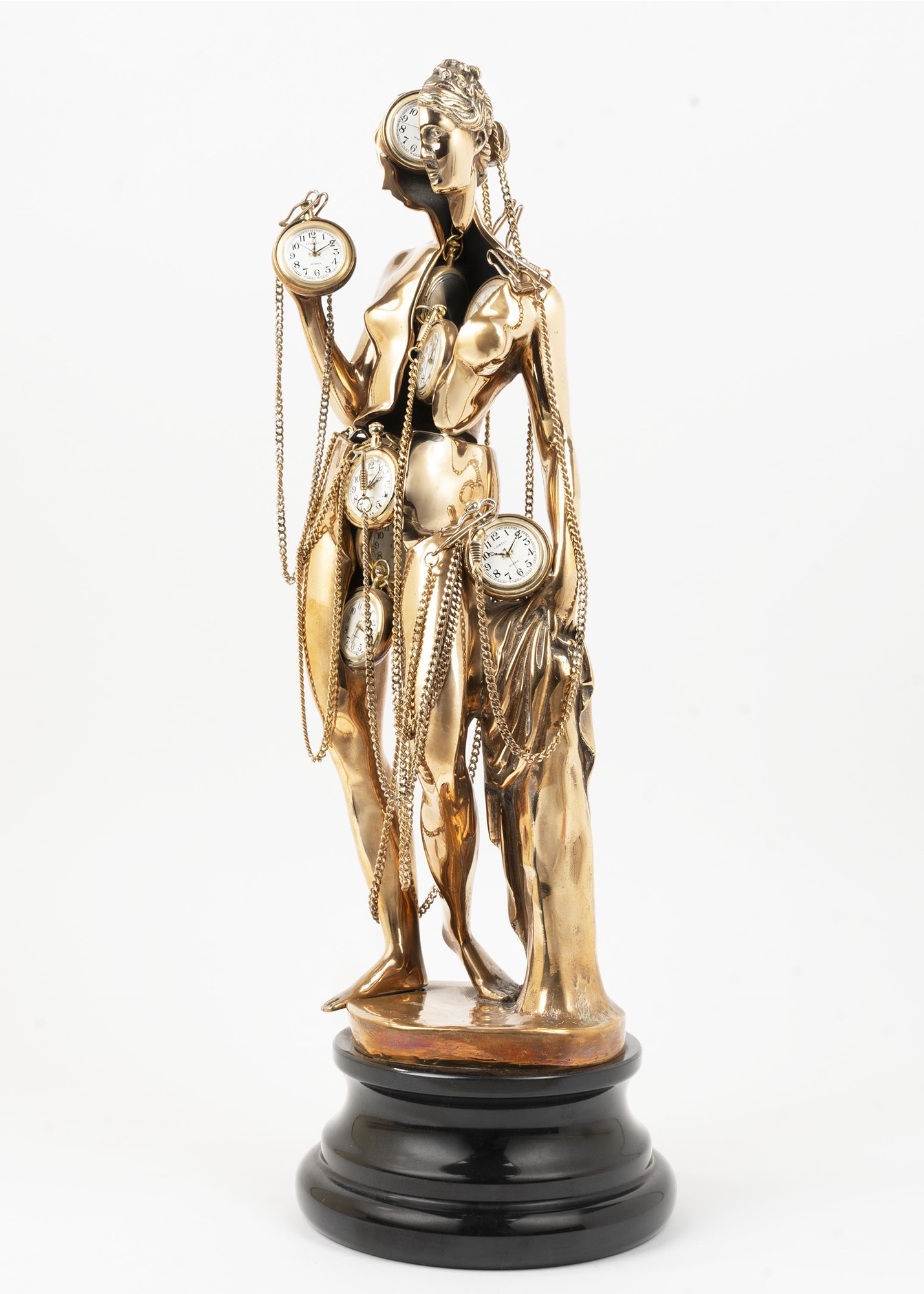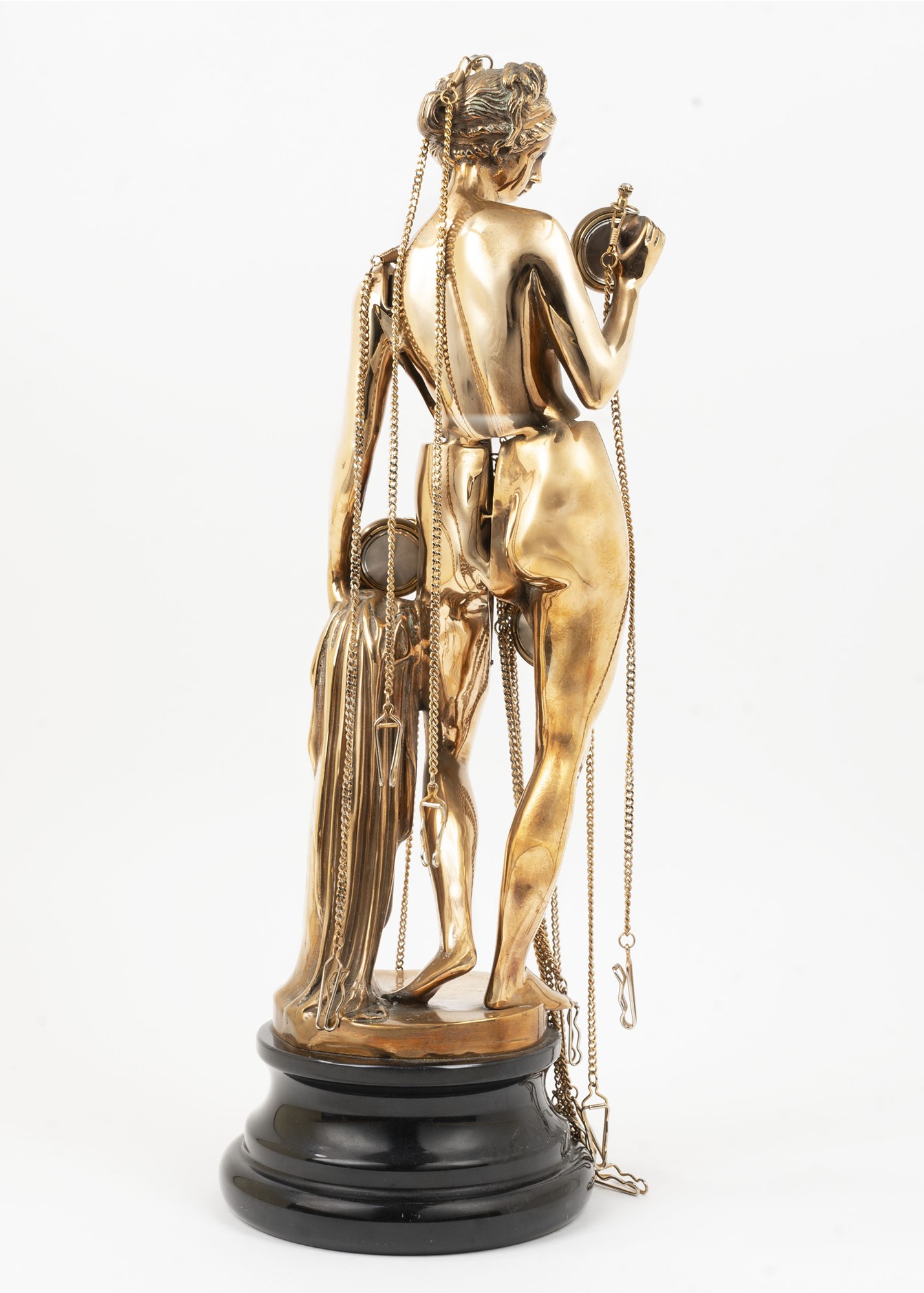 bronzo patina dorata e orologi da tasca su base in marmo nero, es. XXI/XXX