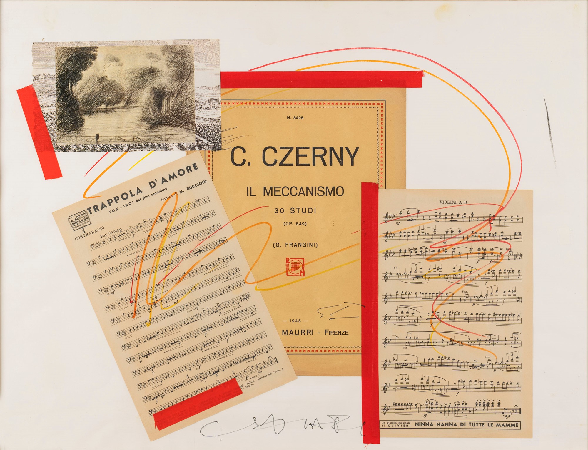 collage di spartiti musicali, pagine di libro, nastro adesivo rosso e pennafeltro colorate