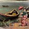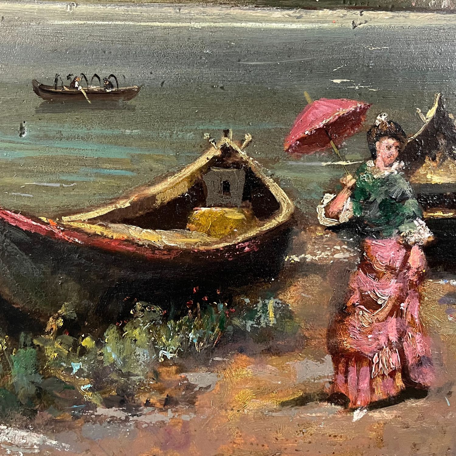 Dipinto olio su tela attaccata su tavola, periodo XIX secolo, raffigurante Donna su marina veneziana.