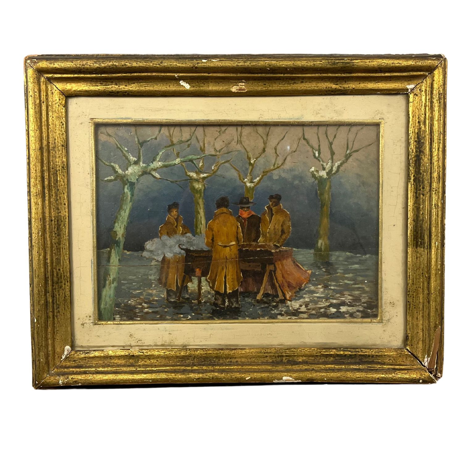 Dipinto olio su tavola, periodo inizio XX secolo, raffigurante Il venditore di castagne.