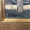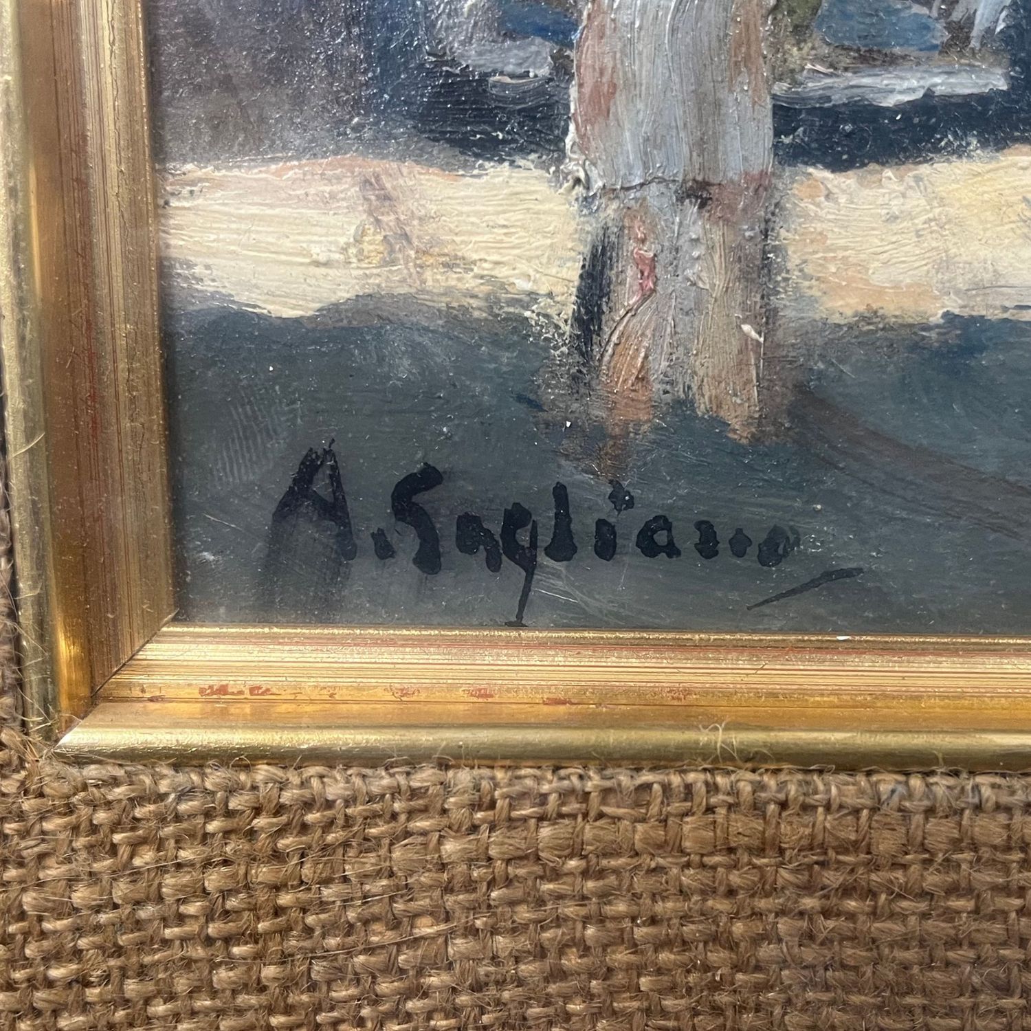 Dipinto olio su pannello, periodo XX secolo, raffigurante Marina con personaggi e barche.