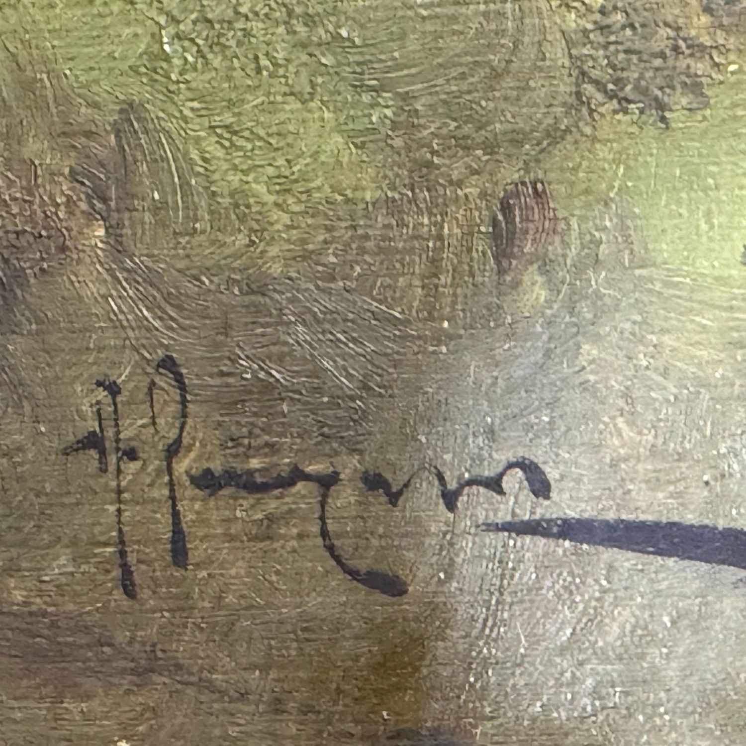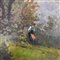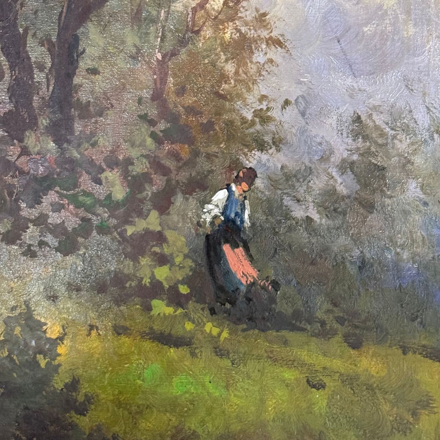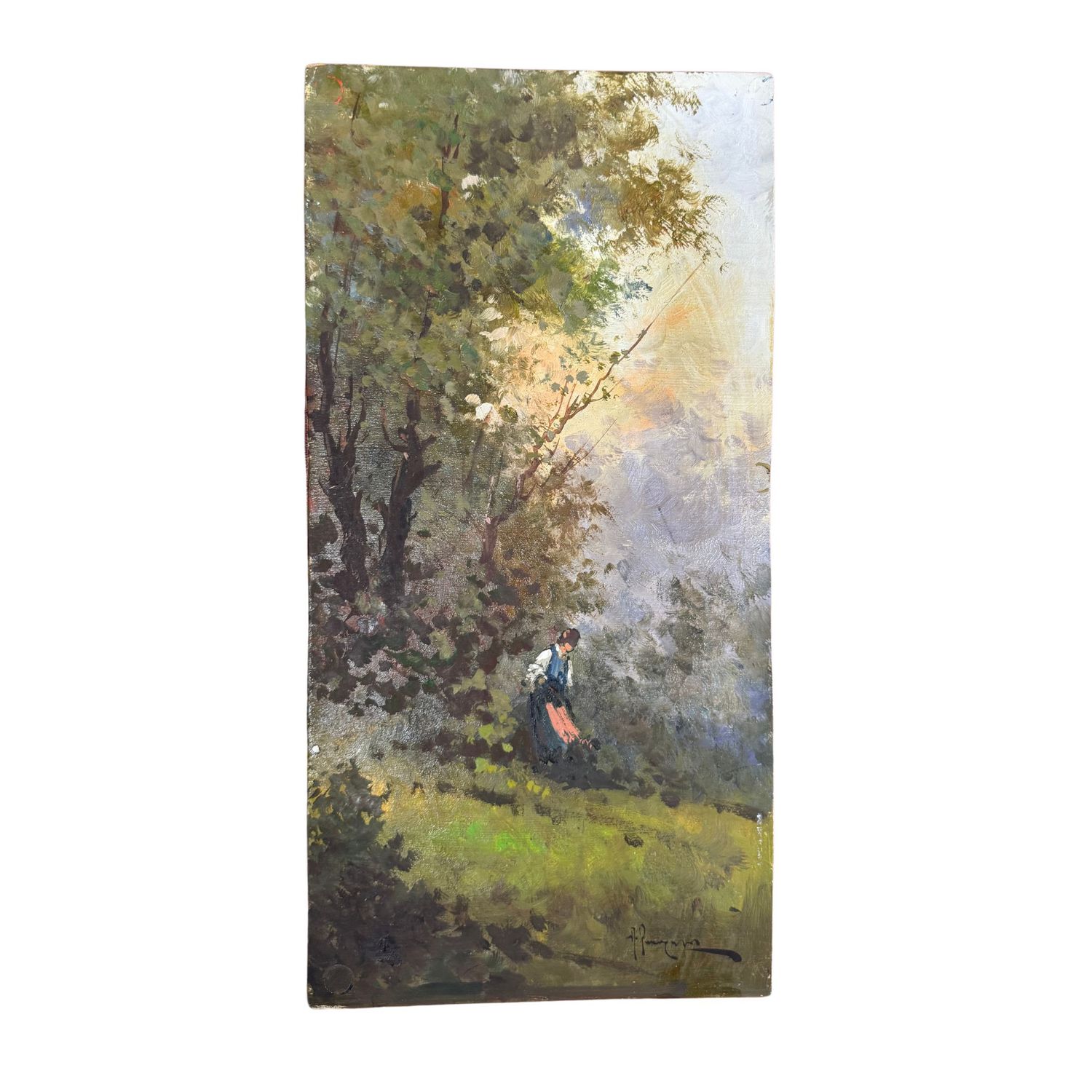 Dipinto olio su tavola, periodo XX secolo, raffigurante Paesaggio con personaggio.