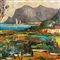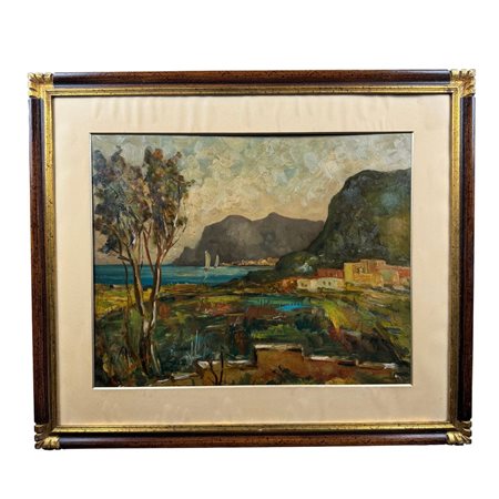 Dipinto olio su pannello, periodo XX secolo scuola Italiana, raffigurante Veduta di Costiera.