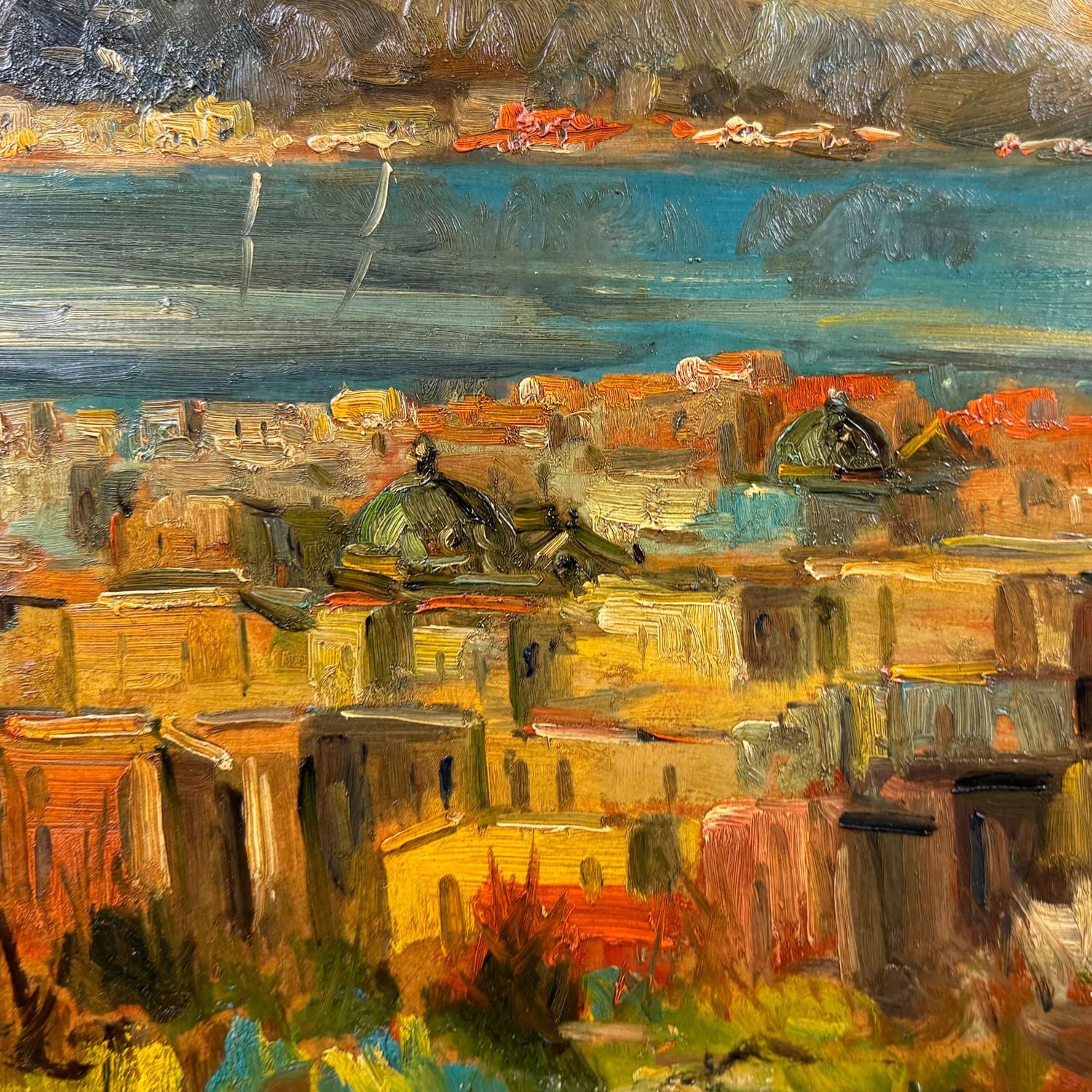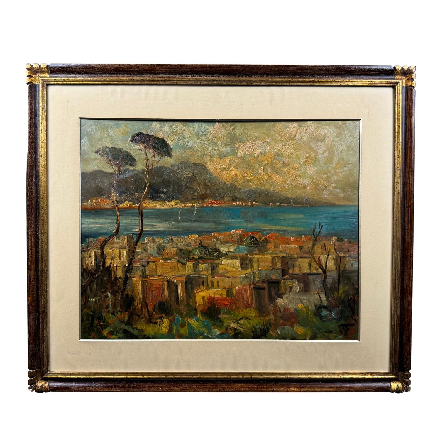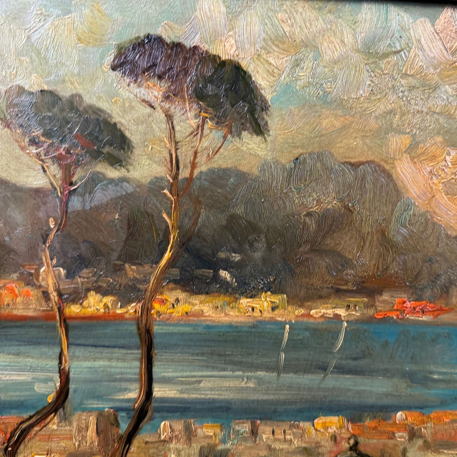 Dipinto olio su pannello, periodo XX secolo scuola Italiana, raffigurante Paesaggio con marina.