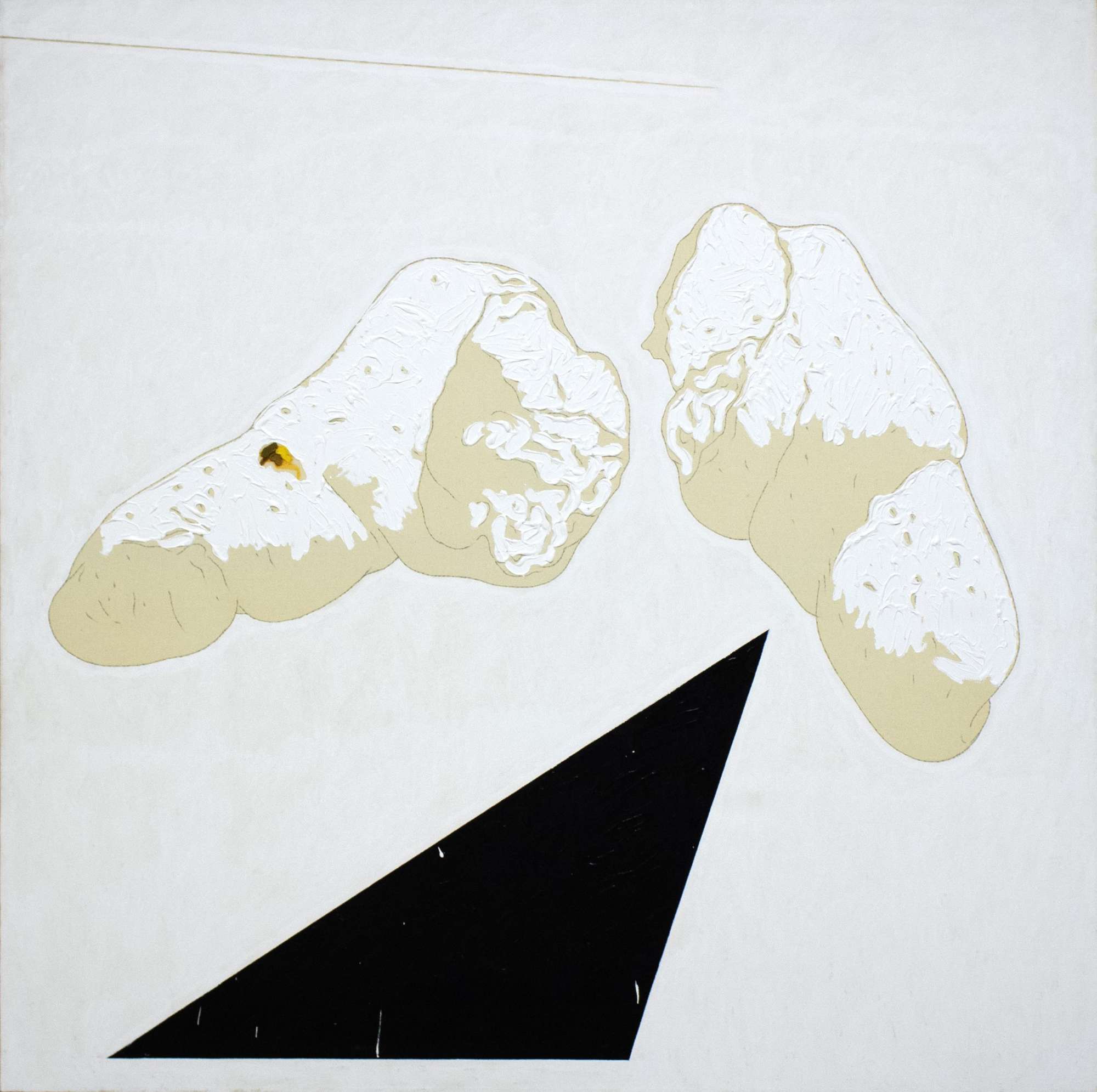Concetto Pozzati, Pane bianco…quotidiano, 1985-1986, olio e acrilico su tela, cm 200x200, opera registrata presso l'Archivio Pozzati, opera soggetta a diritto di seguito. Opera esposta alla XI quadriennale Nazionale d'Arte Moderna di Roma.