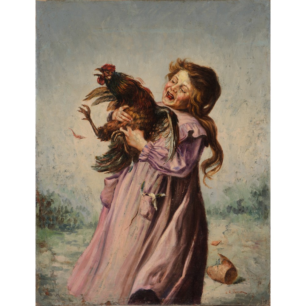 LOUIS ADOLPHE TESSIER, Fanciulla con gallo, Olio su tela