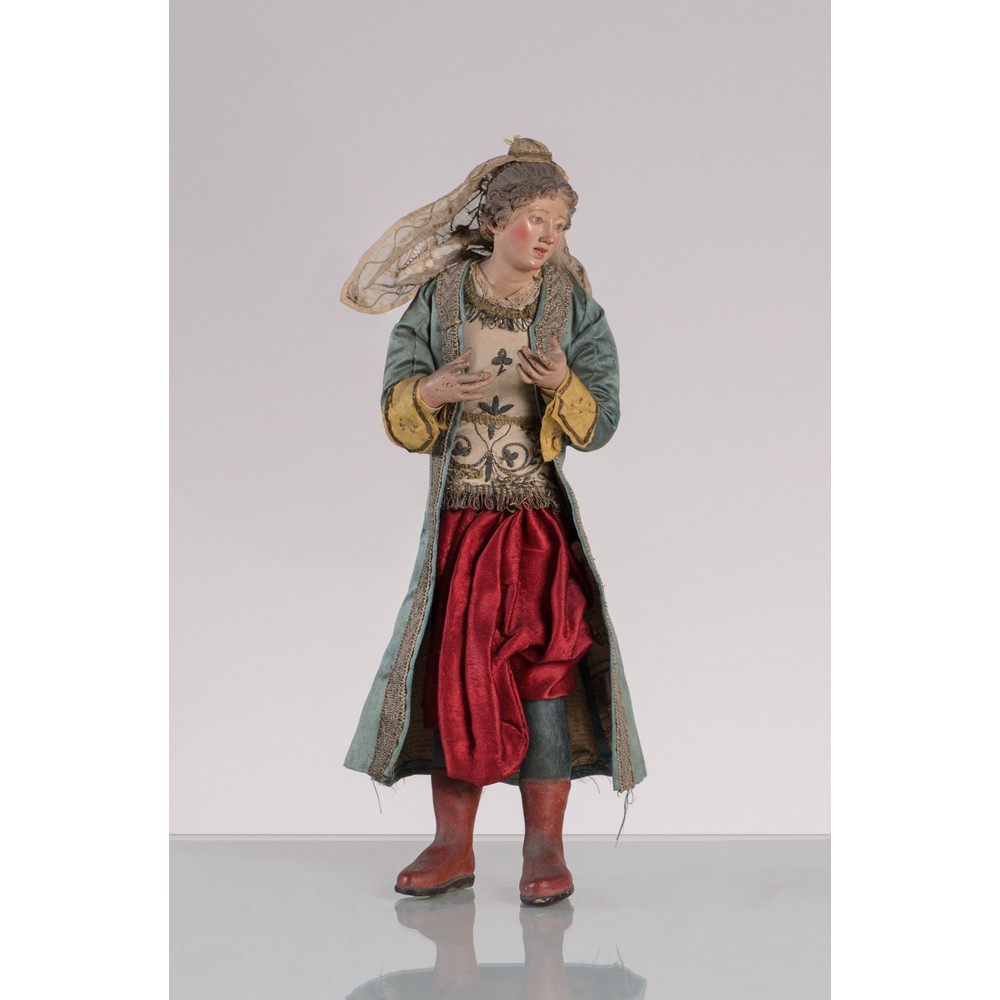 Scultura in terracotta policroma e legno raffigurante "Giovane donna con abiti ricamati"