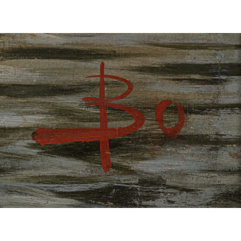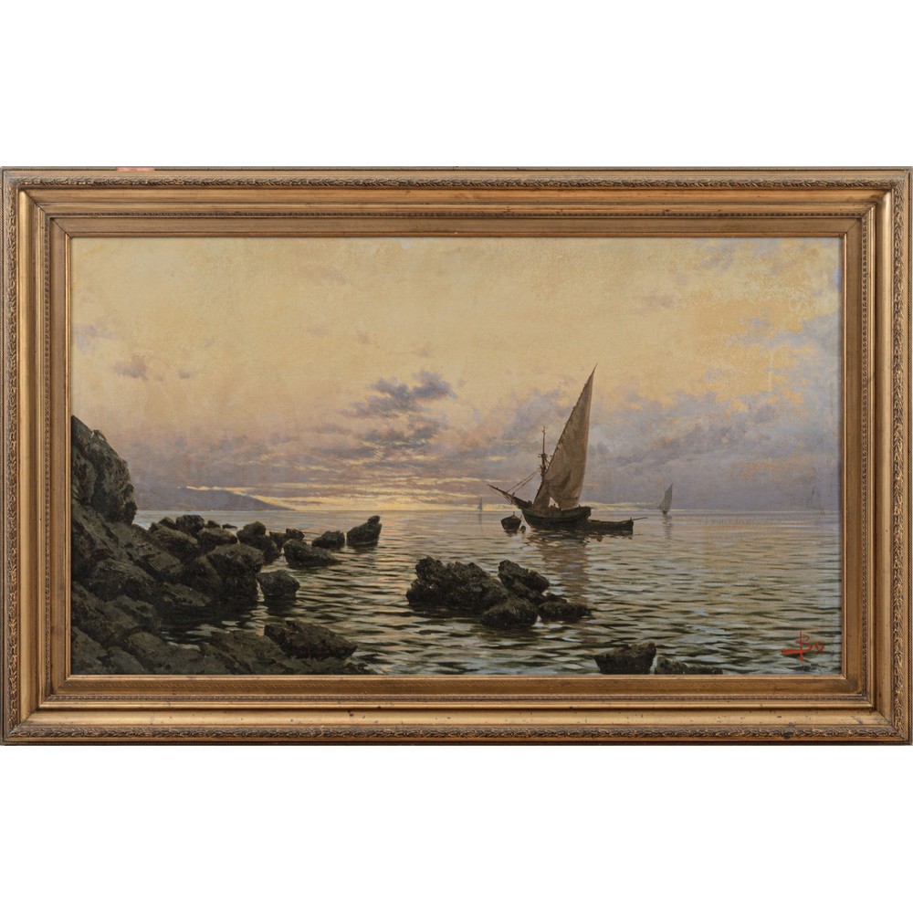 GIACINTO BO, Paesaggio marino con barche, Olio su tela