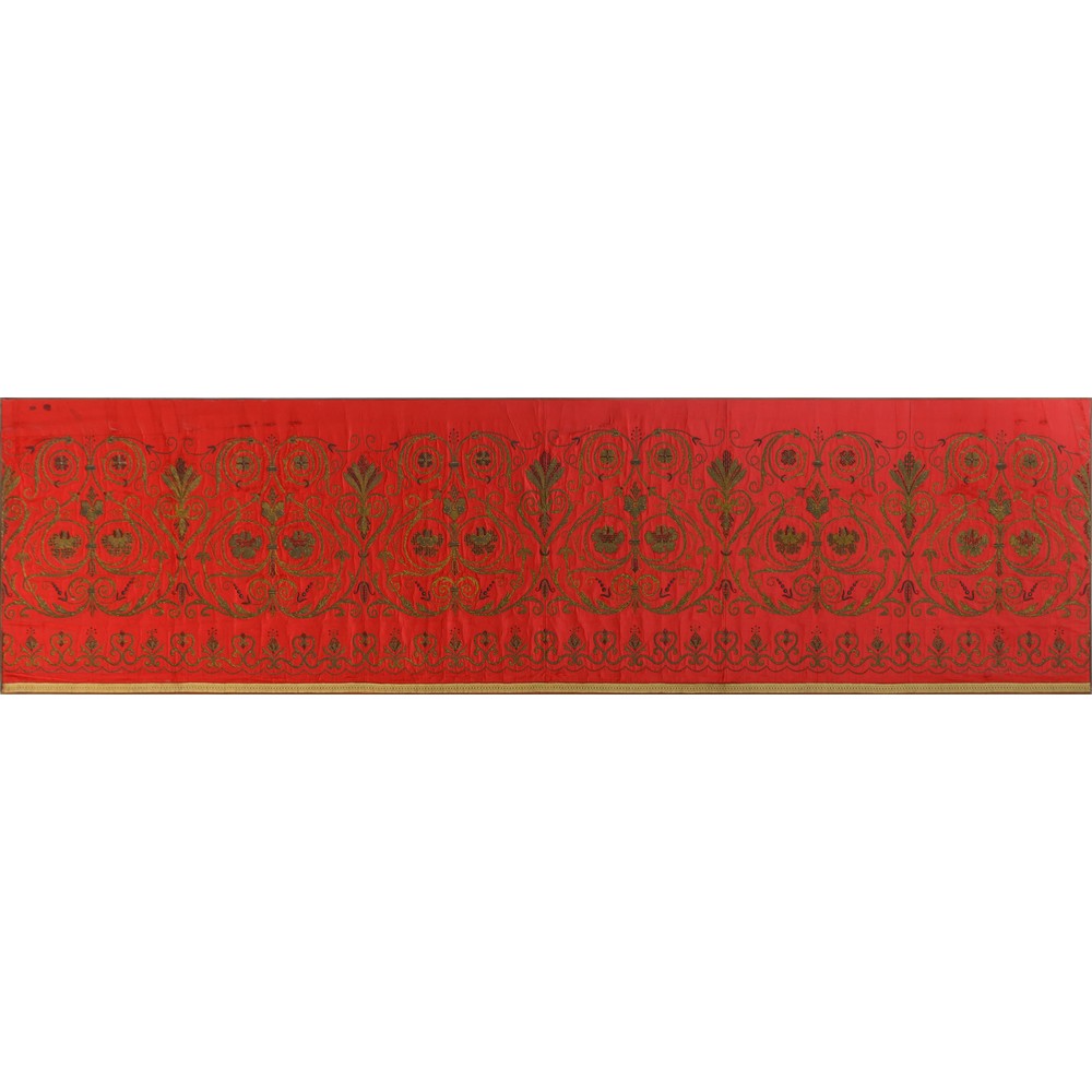 Grande pannello decorativo in tessuto rosso con decori in filigrana dorata.