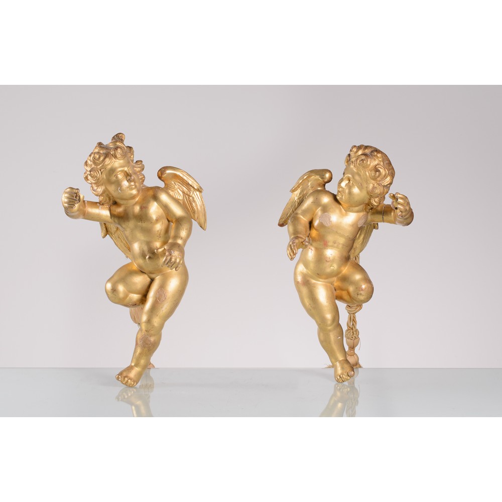 Coppia di sculture raffiguranti "Putti alati" in legno intagliato e dorato (usure e incollaggi)