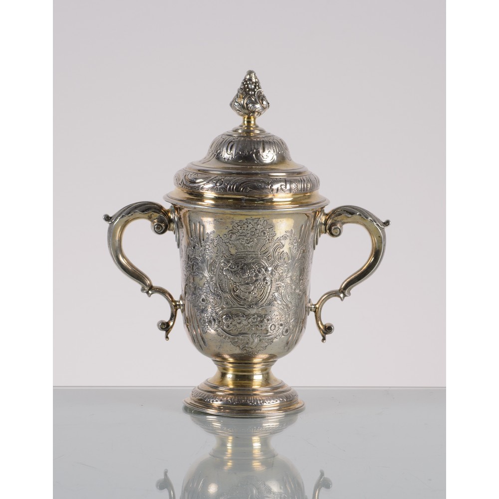 Coppa con coperchio Giorgio II in argento riccamente sbalzato e cesellato, interno in argento vermeil. Punzone argentiere WW (g. 1357).