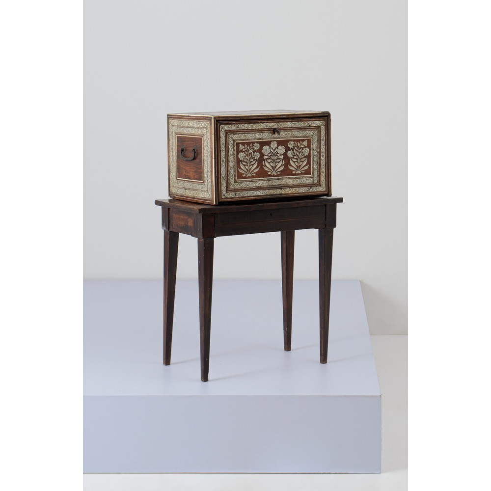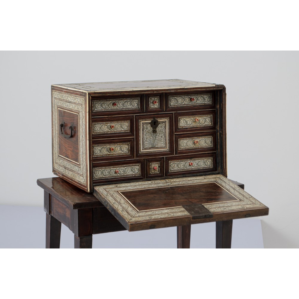 Piccolo monetiere da viaggio in legno di mogano, riccamente intarsiato e decorato in osso con base in legno non coevo.