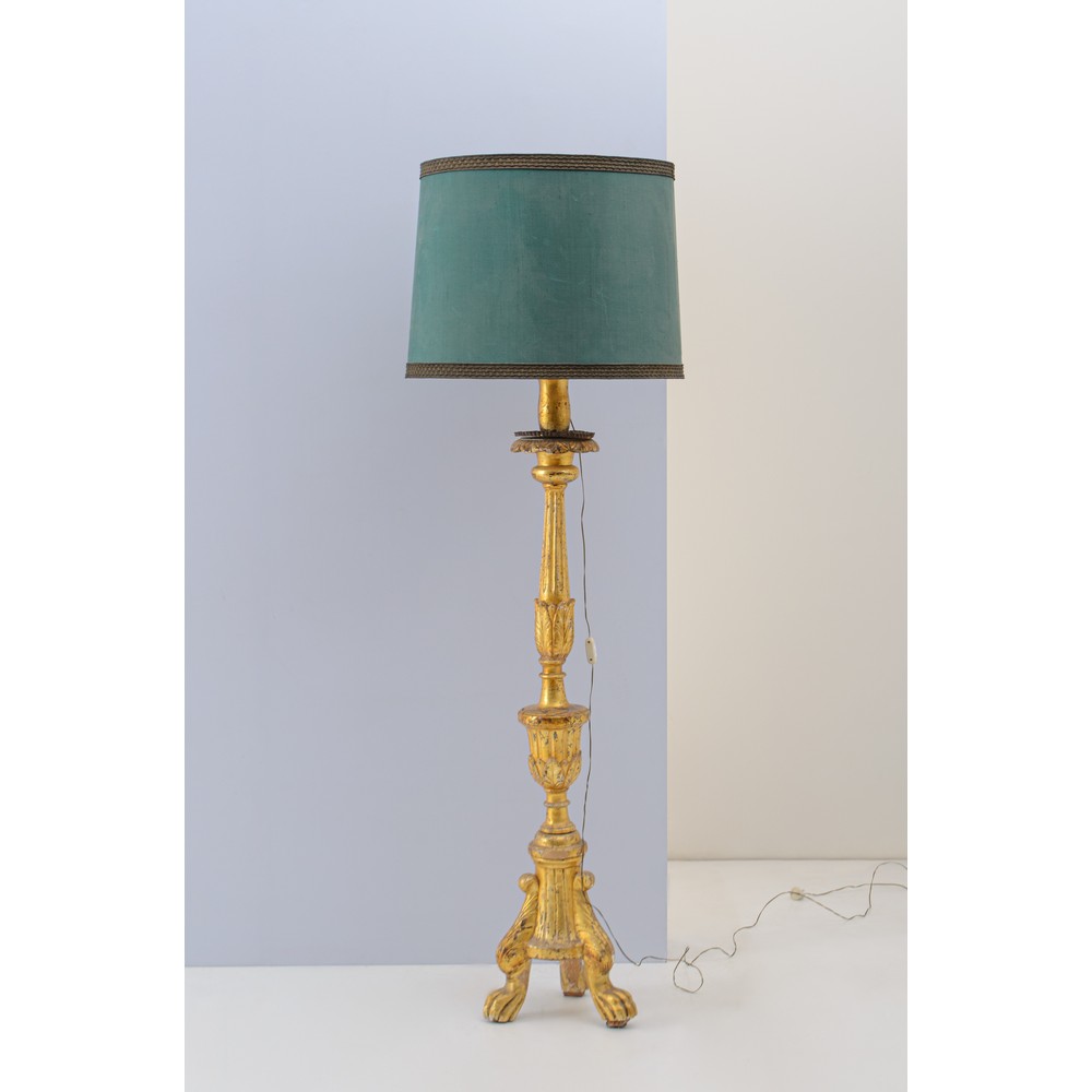 Torciere elettrificato in legno dorato ad argento e mistura con paralume in tessuto.