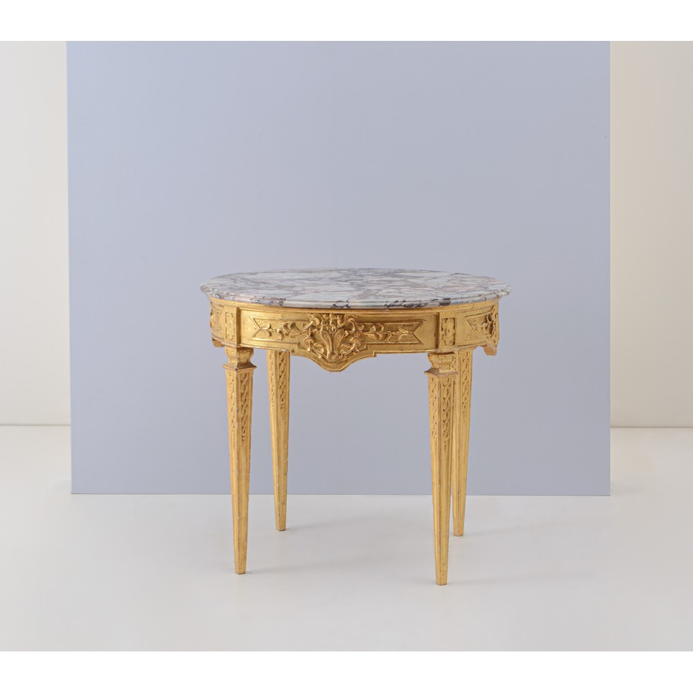Tavolo da centro di epoca direttorio in legno intagliato e dorato con piano in marmo sagomato.