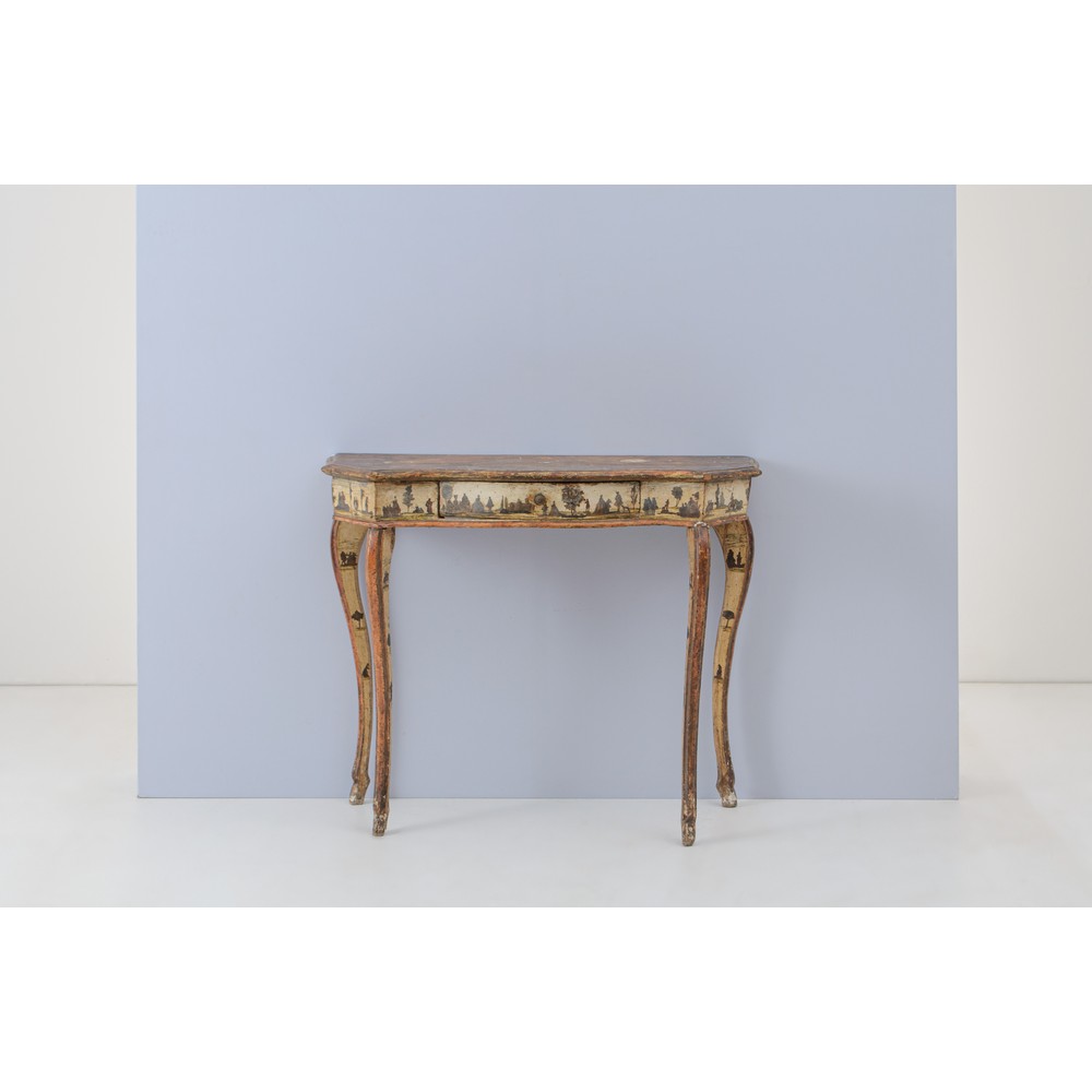 Piccola consolle arte povera di forma sagomata in legno laccato, dipinto e decori raffiguranti "Scene di vita" con cassetto centrale.