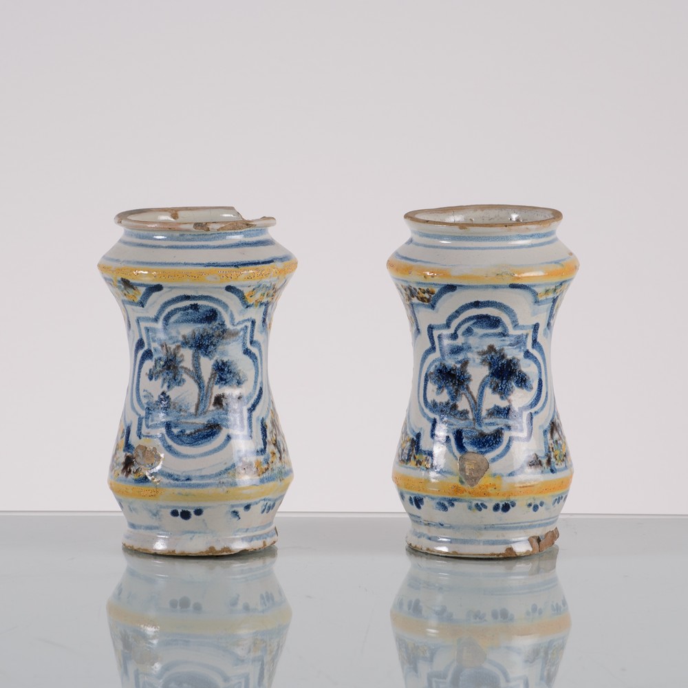 Coppia di albarelli in maiolica policroma nei toni del blu cobalto, giallo antimonio e marrone di manganese con decorazioni a ramage (rotture).