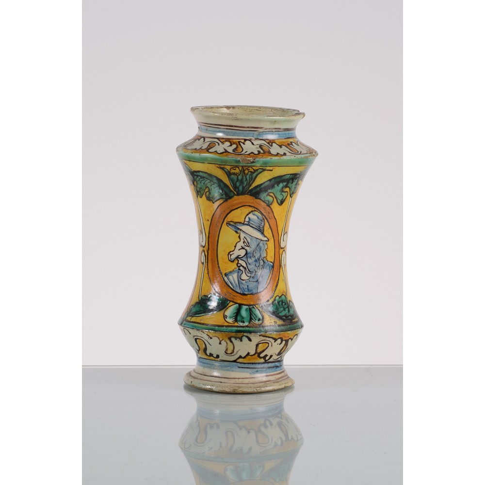 Albarello in ceramica smaltata e decorata con medaglioni raffiguranti "Mezzo busto di figura maschile" e "Mezzo busto di figura femminile" (difetti e mancanze).