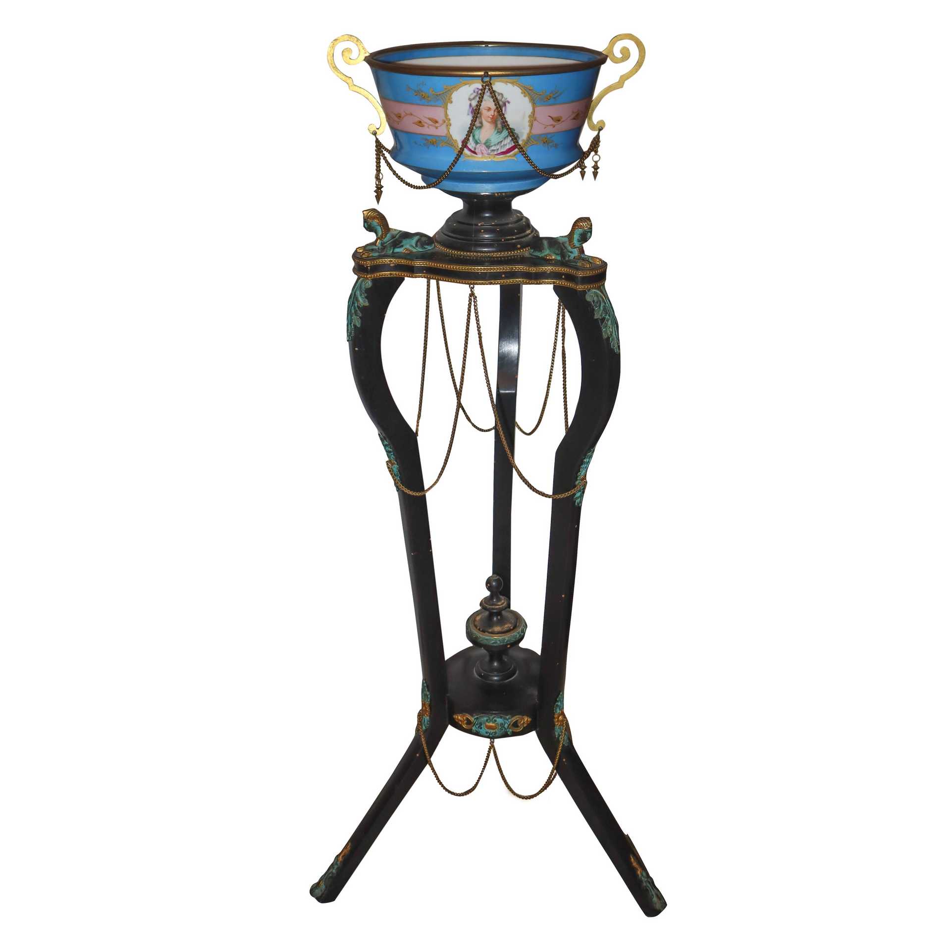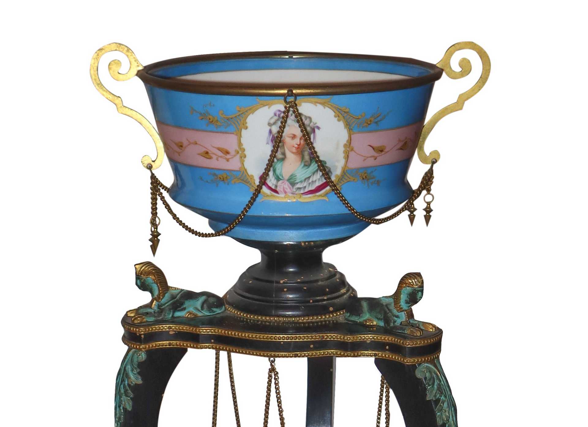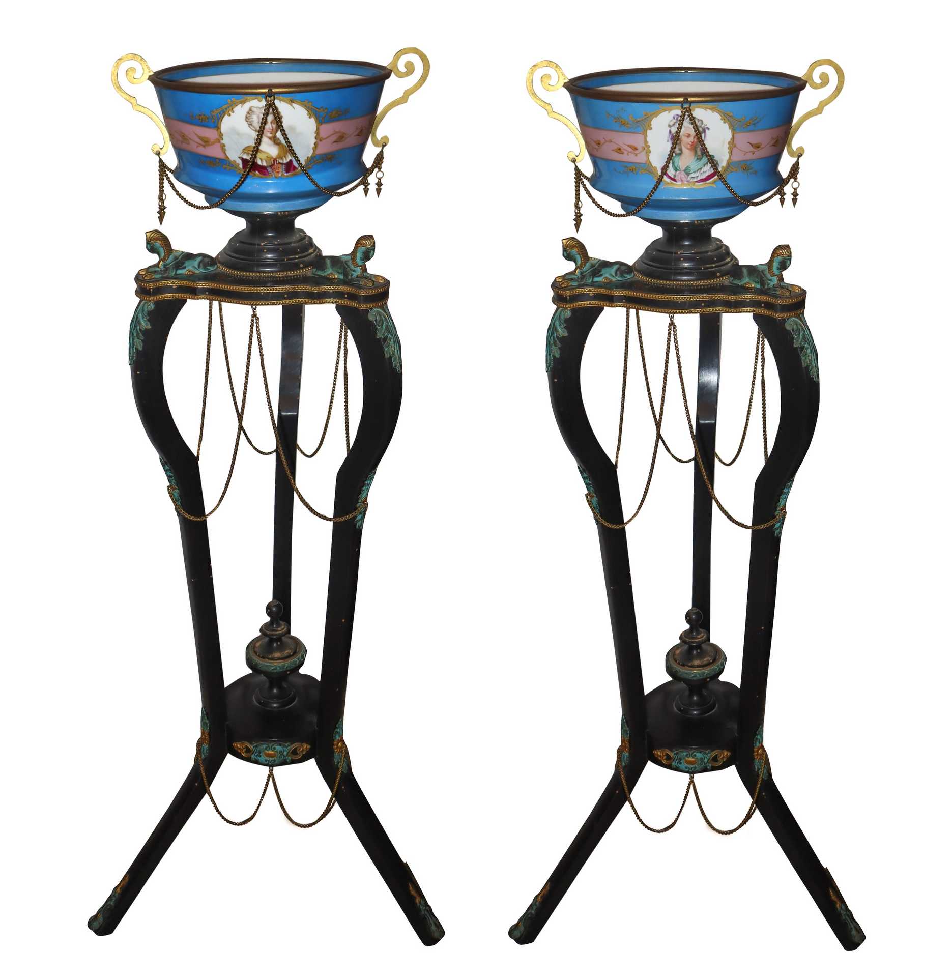 Bronzi sormontati da vasi in porcellana nei toni del azzurro di sevres, con sul fronte figure femminili.