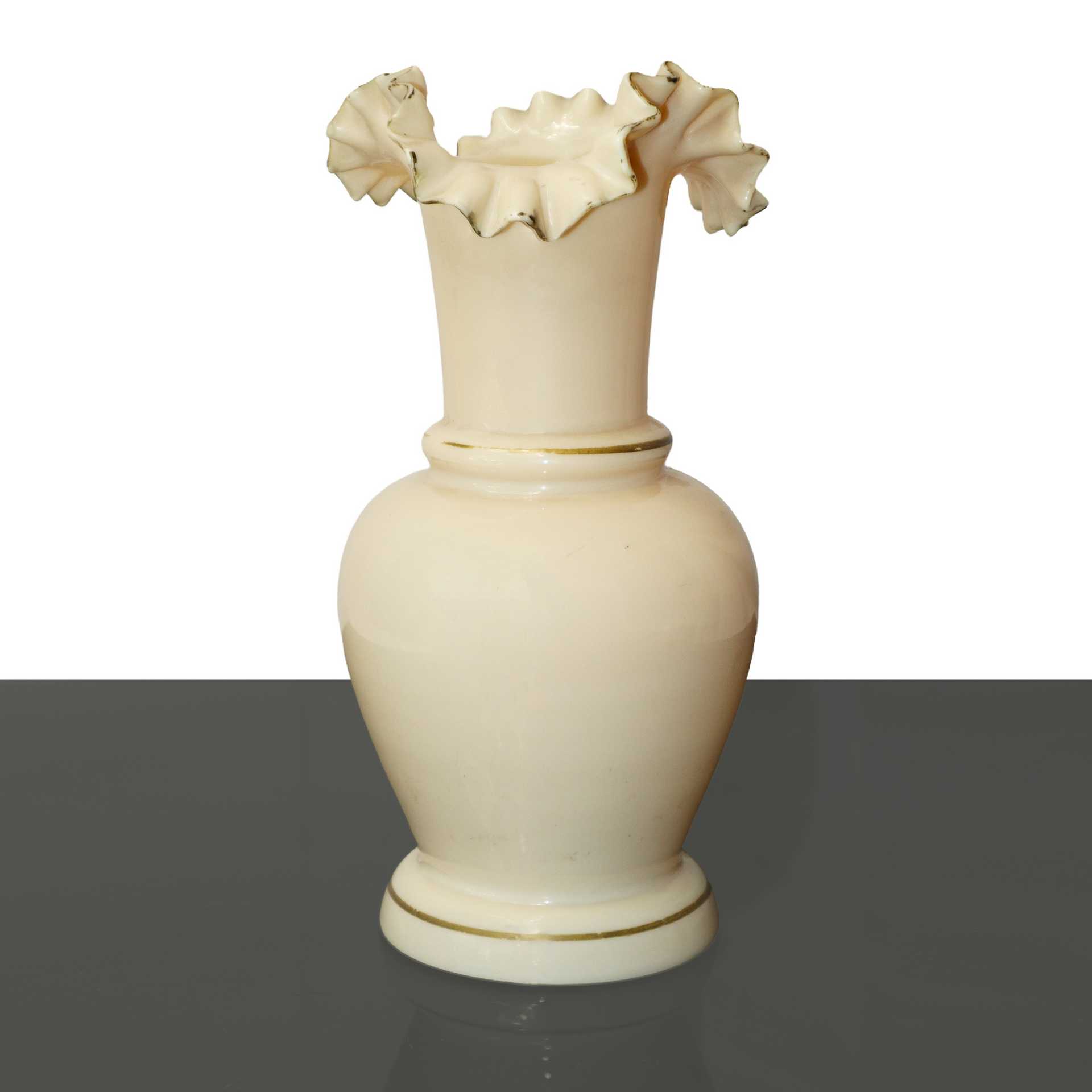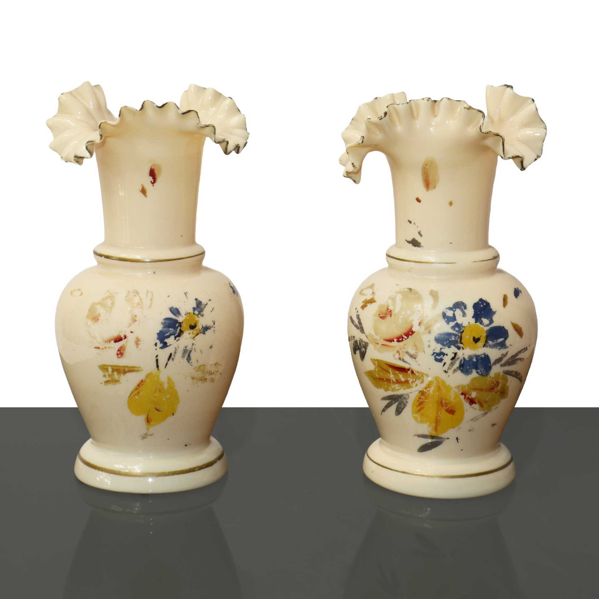 Coppia di vasi in opaline di vetro, beige, dipinto a mano con fiori policromi e bordo pieghettato, 19° secolo