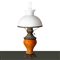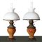 Coppia di lumi a petrolio con disegni floreali , 19° secolo H cm 53 Paralume in opaline bianca, piede in metallo e base in maiolica.Paralume in opaline bianca, piede in metallo e base in maiolica.