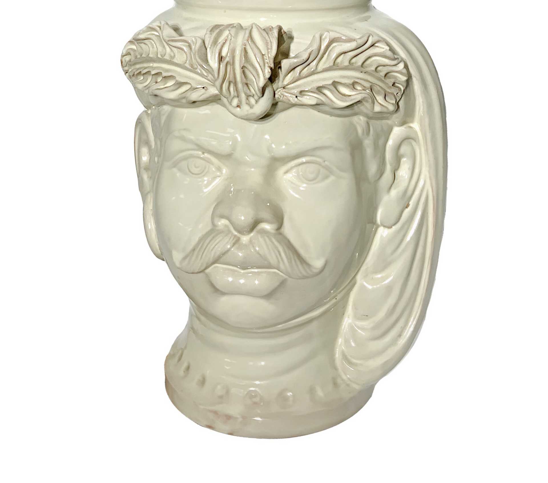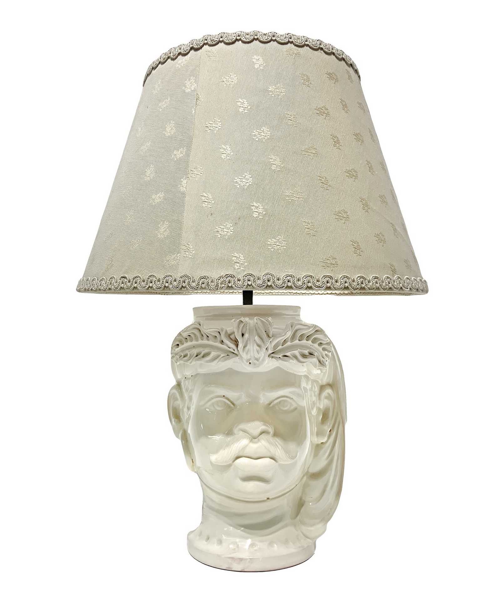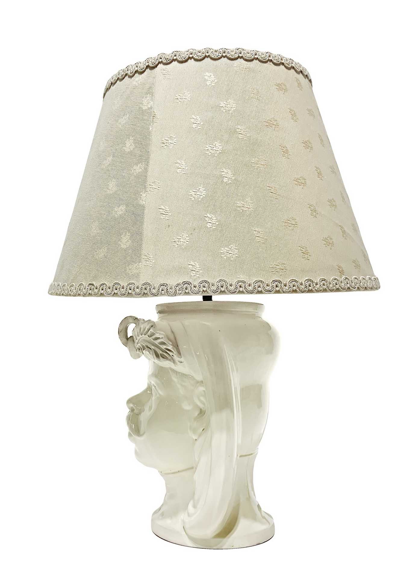 Lume con base in maiolica di Caltagirone raffigurante moro, 20° secolo H 26 cm, diametro 15 cm Nel colore bianco panna, firmato M.PatriNel colore bianco panna, firmato M.Patri