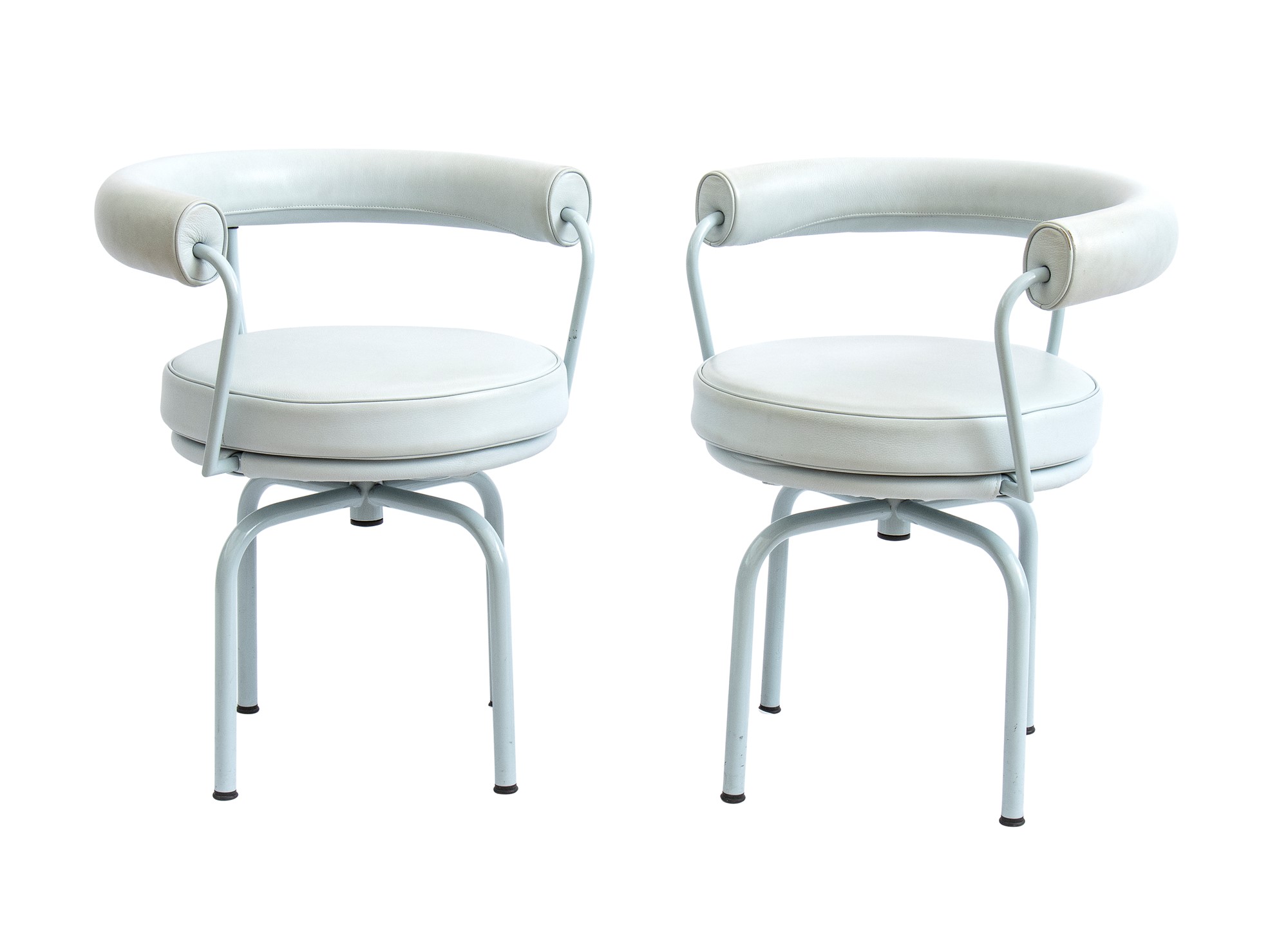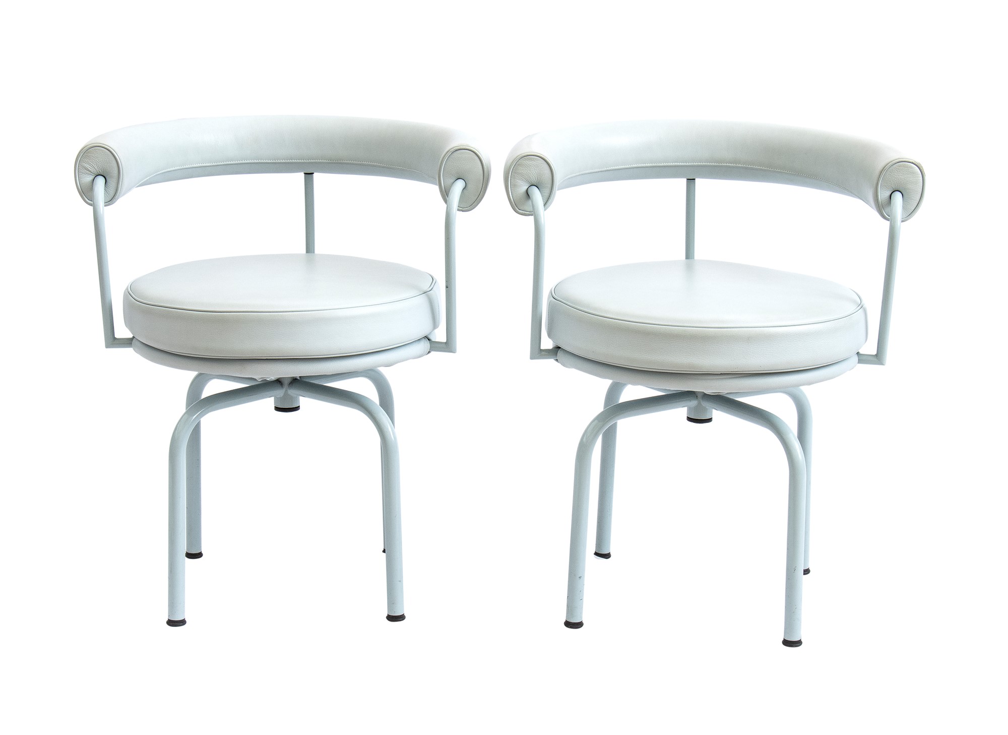 Coppia di poltroncine girevoli LC7 rivestite in pelle bianca