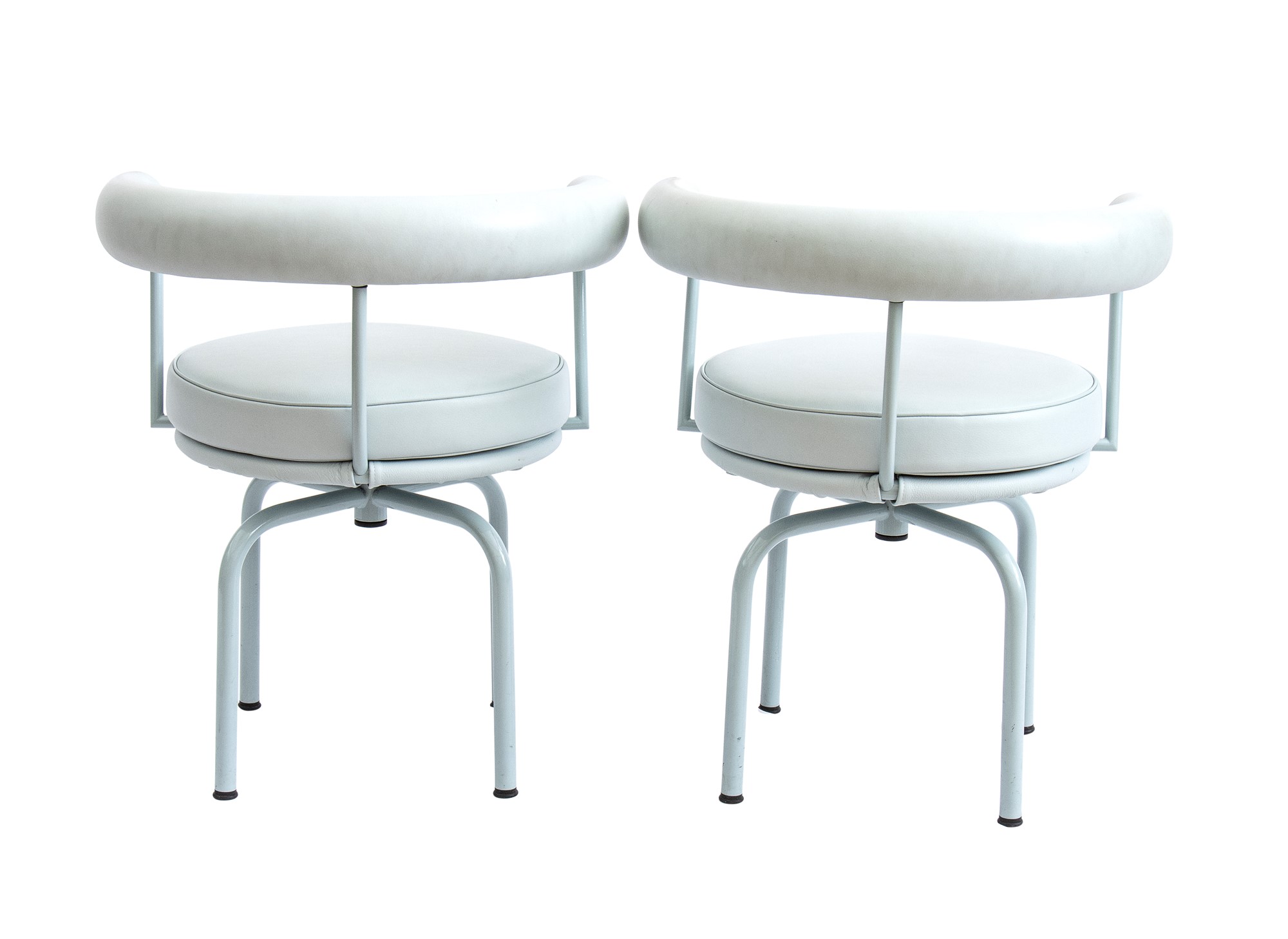 Coppia di poltroncine girevoli LC7 rivestite in pelle bianca Charles Le Corbusier