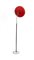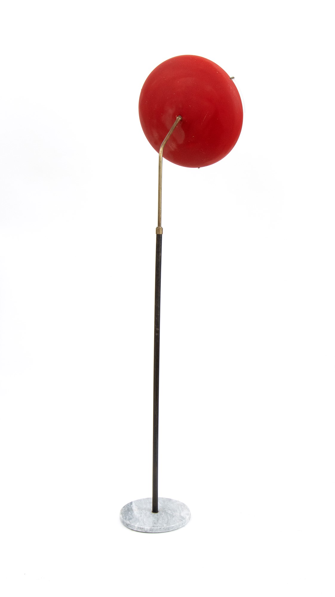 Lampada da terra con stelo in metallo, ottone e diffusore in metallo verniciato rosso.