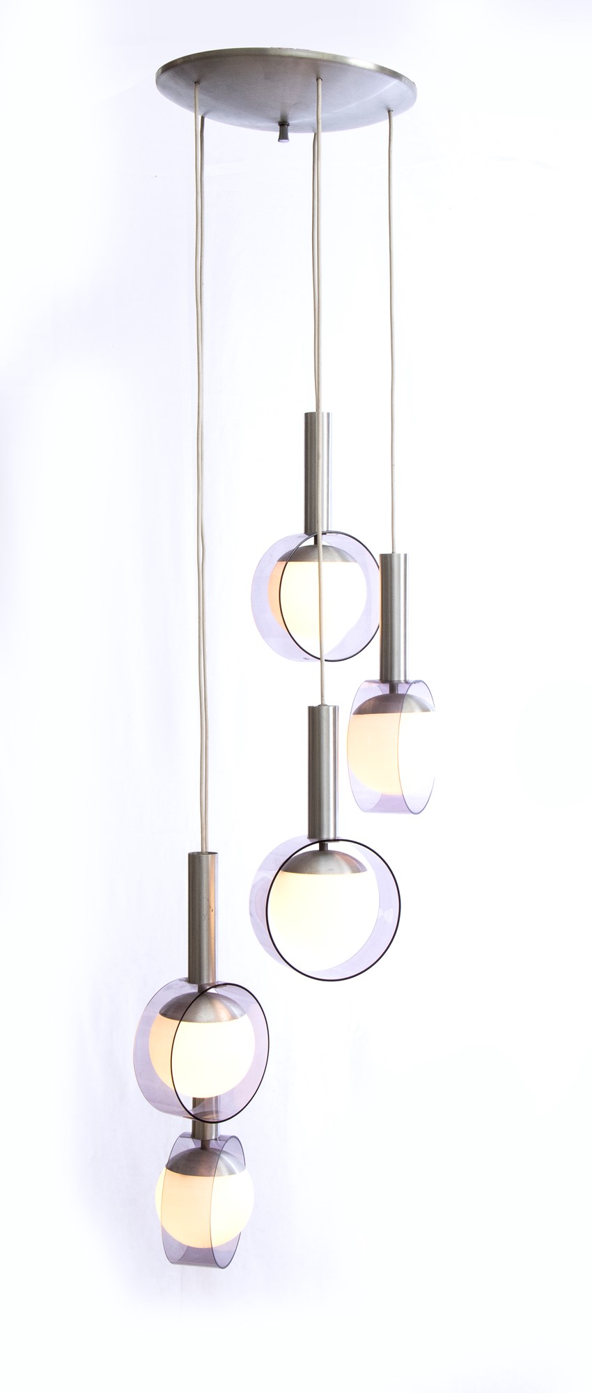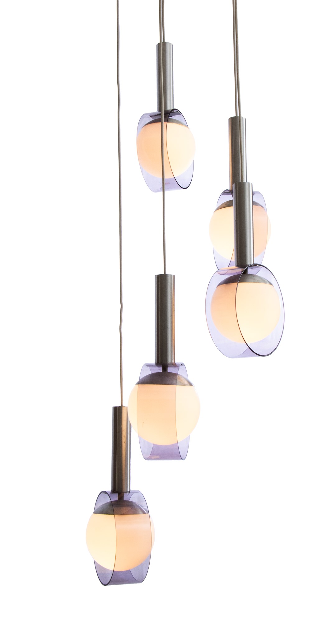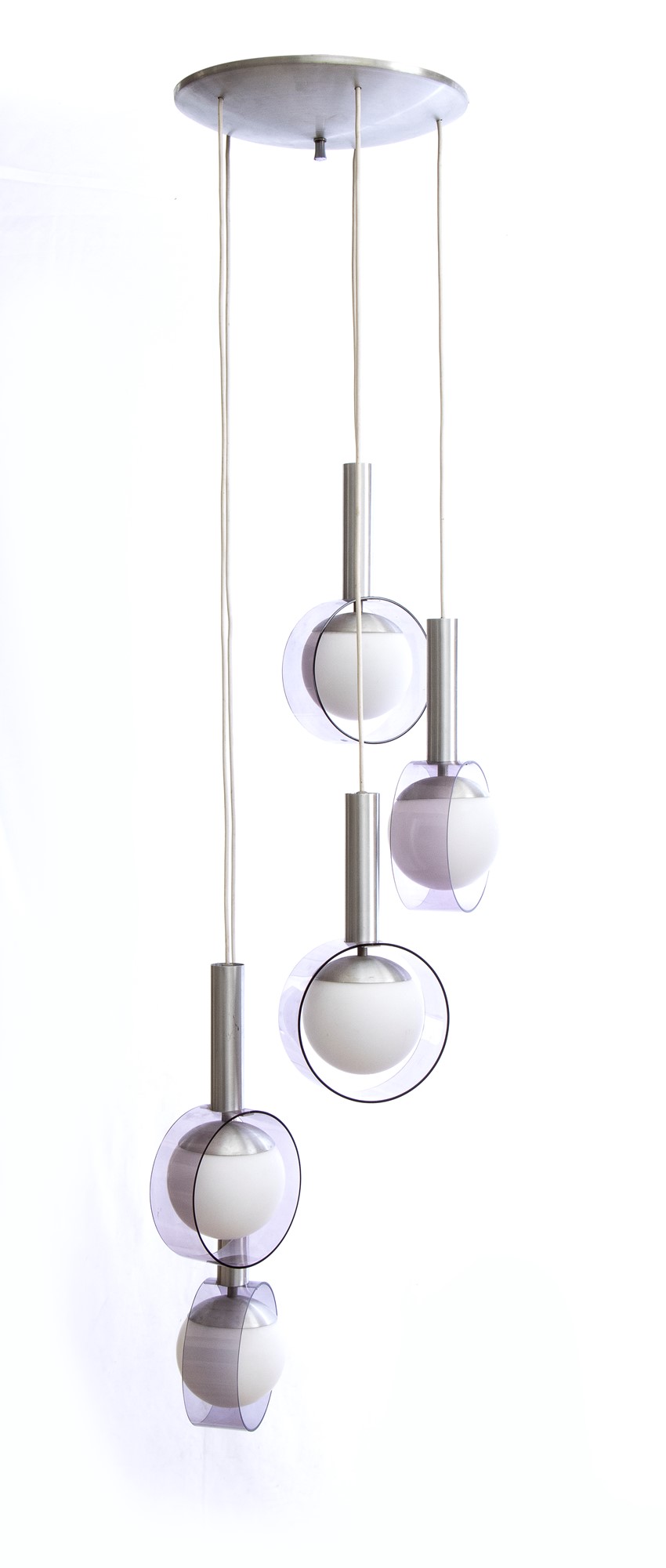 Lampadada a sospensione a cinque luci con struttura in metallo, vetro opalino e metacrilato