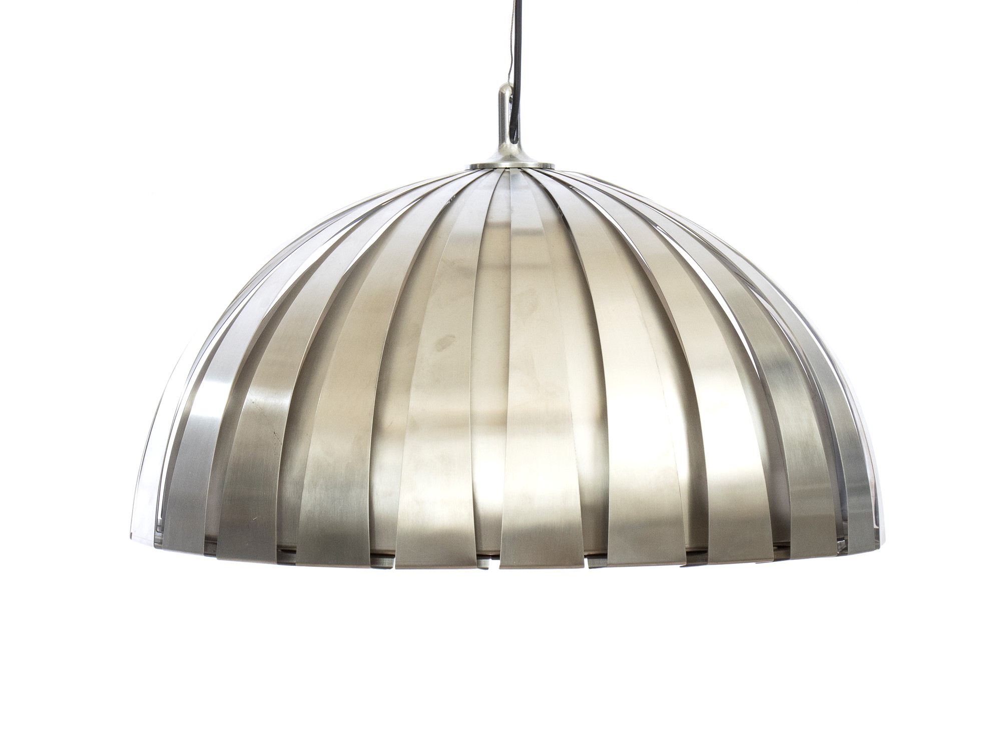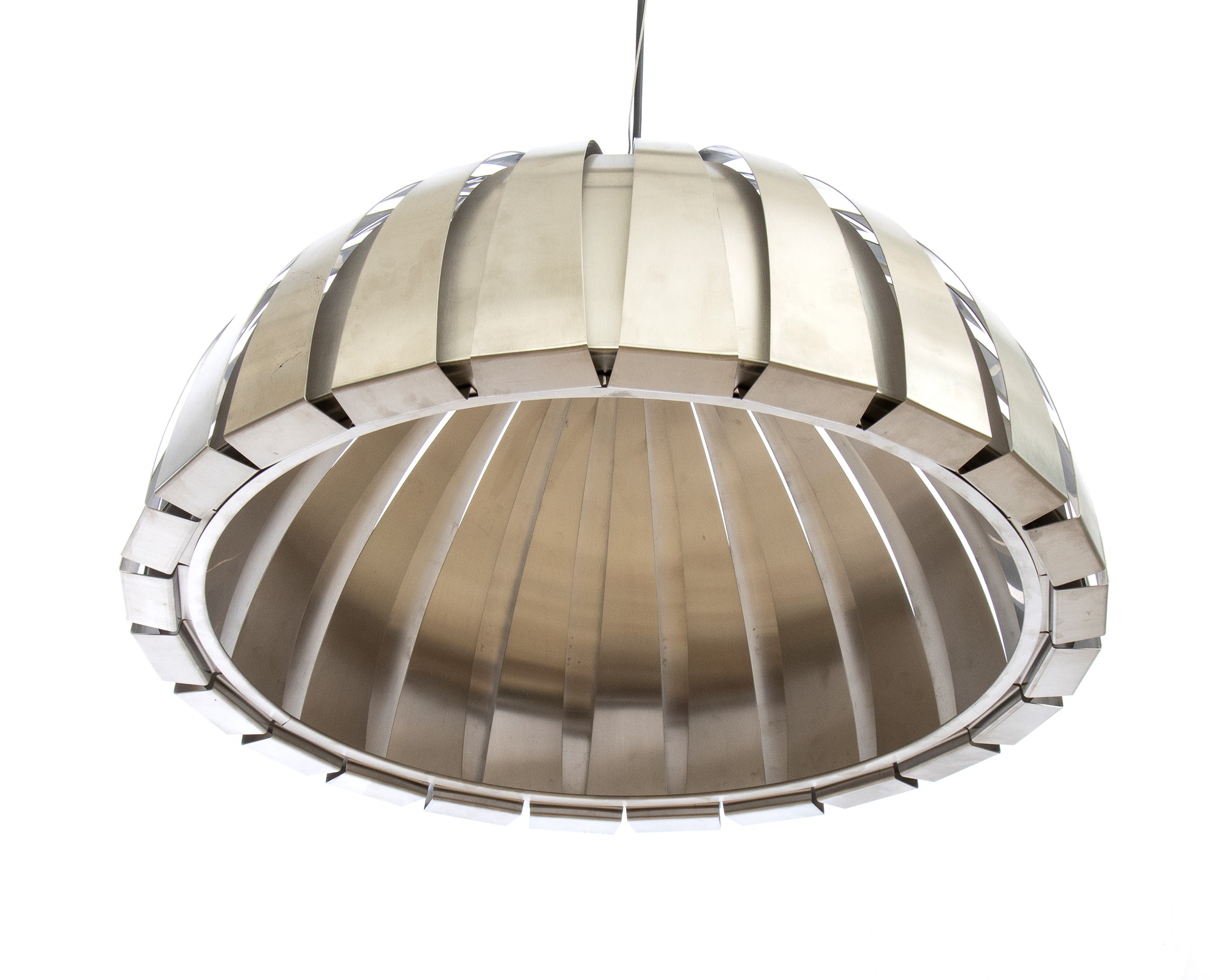 Lampada a sospensione Calotta con diffusore a barre di acciaio cromato piegate e curvate Elio Martinelli
