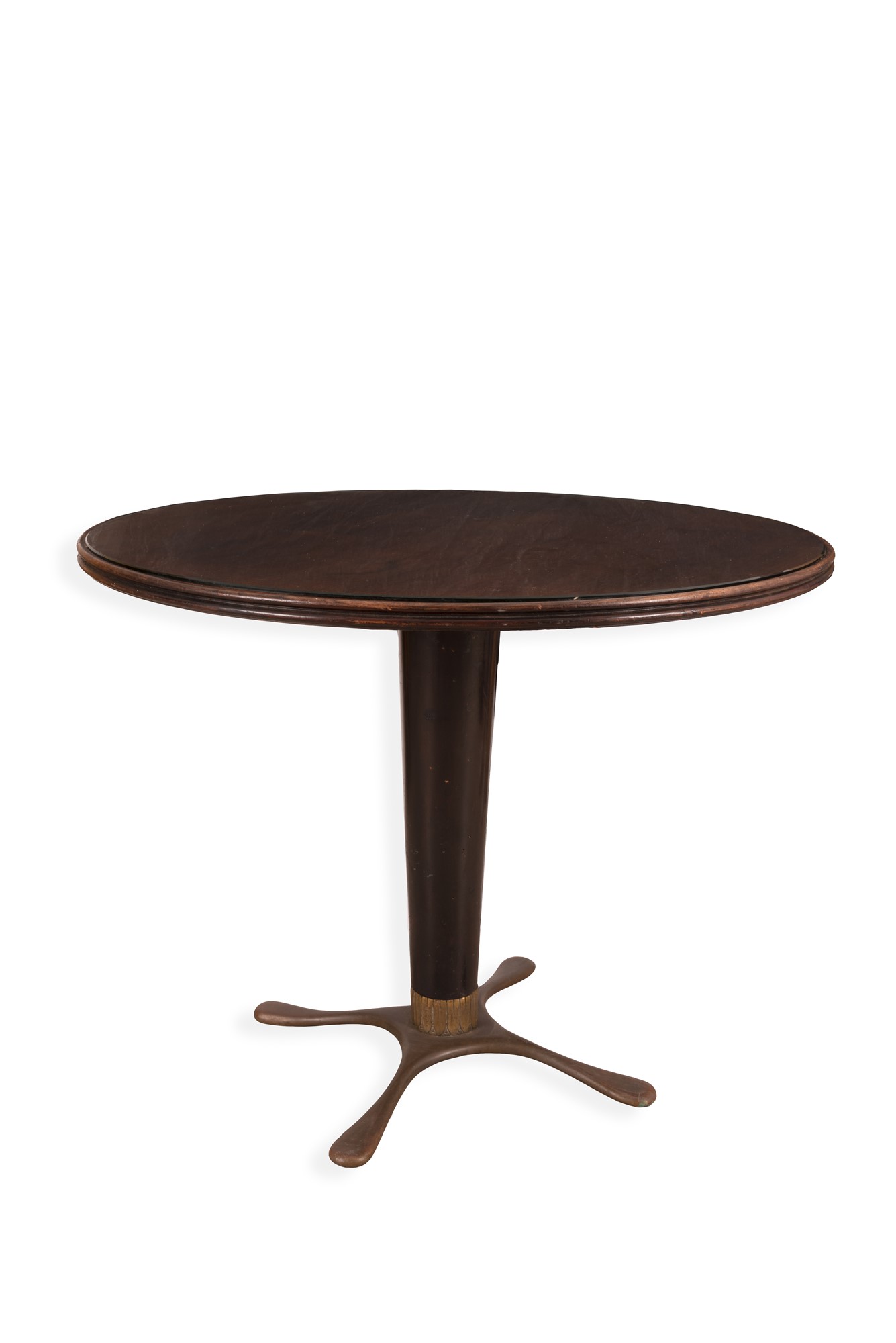 Tavolino tondo in palissandro a colonna centrale rastremata poggiante su 4 piedi in bronzo disposti a raggiera
