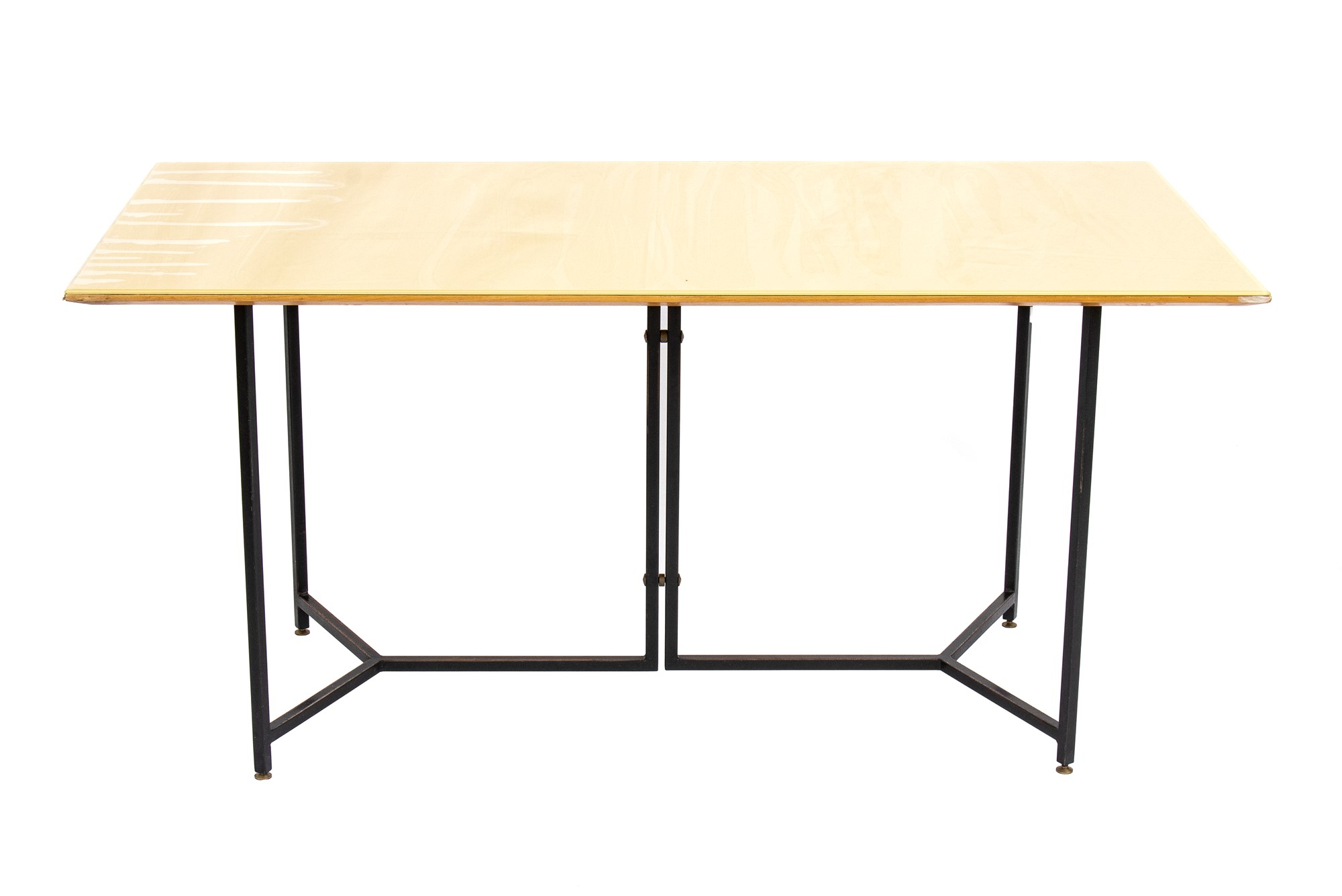 Tavolo rettangolare con struttura in metallo e piano in legno e vetro