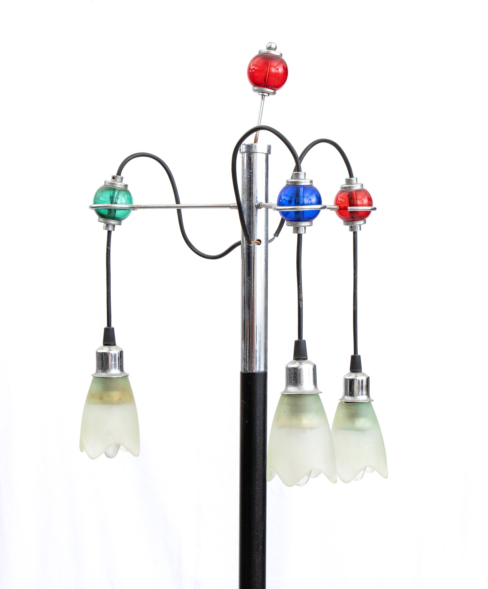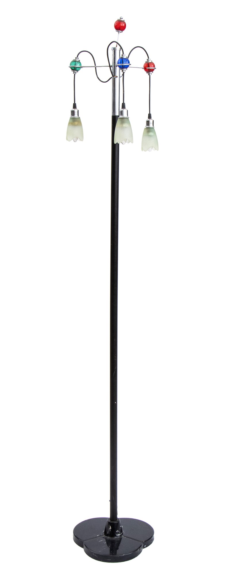 Lot 233 | Lampada da terra in metallo laccato a tre luci con inserti sferici in vetro colorato