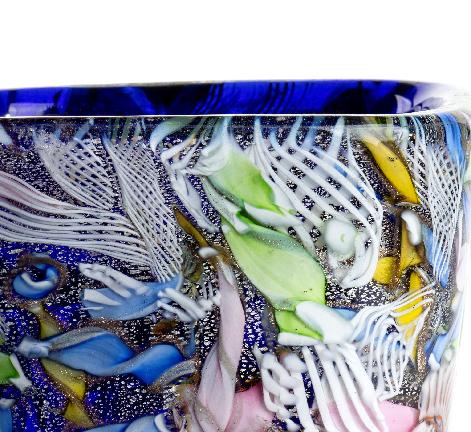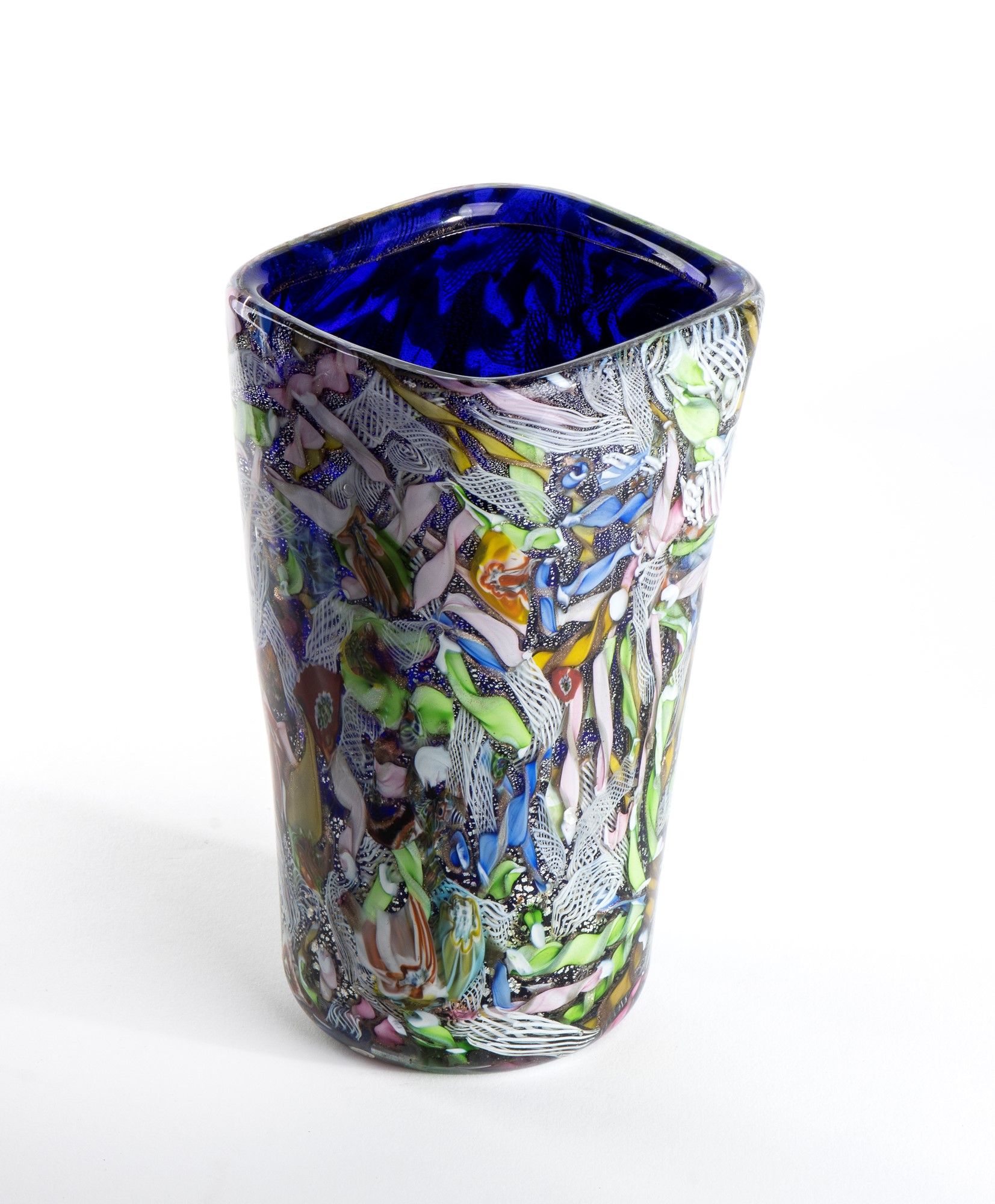 Vaso in vetro sommerso con inclusione di murrine policrome e spruzzature in oro