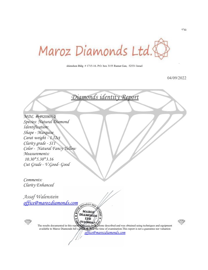 DIAMANTE NATURAL POLISHED 1,12 CARATI COLORE FANCY GIALLO - PUREZZA SI1 - TAGLIO MARCHESE - CERTIFICATO GEMMOLOGICO MAROZ DIAMONDS LTD MEMBRO ISRAEL DIAMOND EXCHANGE - HR20901-2