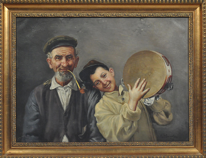 Busciolano Vincenzo (Napoli 1851-1926) Vecchio con ragazzo con tamburello olio su tela, cm 37x51 firmato e datato in basso a destra: Vin.zo Busciolano 1914