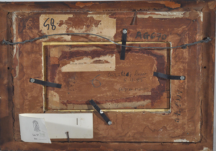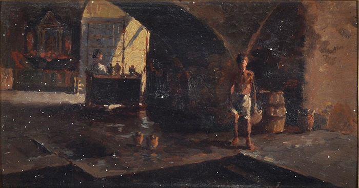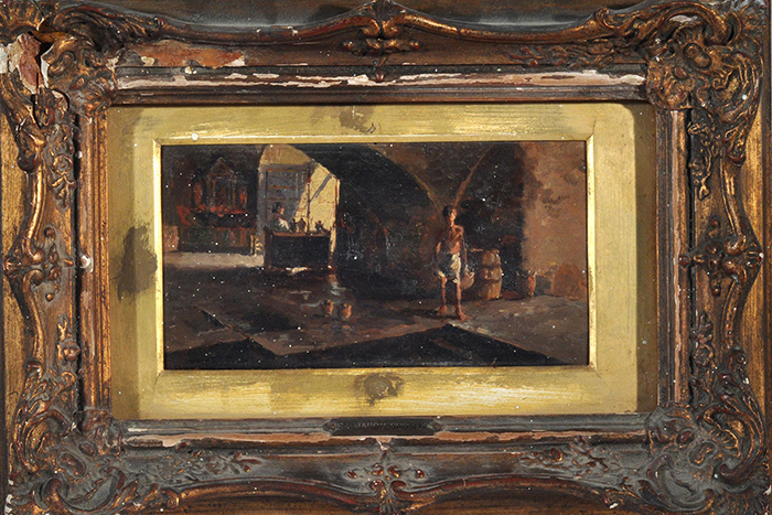 Esposito Gaetano (Salerno 1858 - Sala Consilina, SA 1911) Interno con figure olio su tavola, cm 10x19,5 a tergo cartellino Christie's