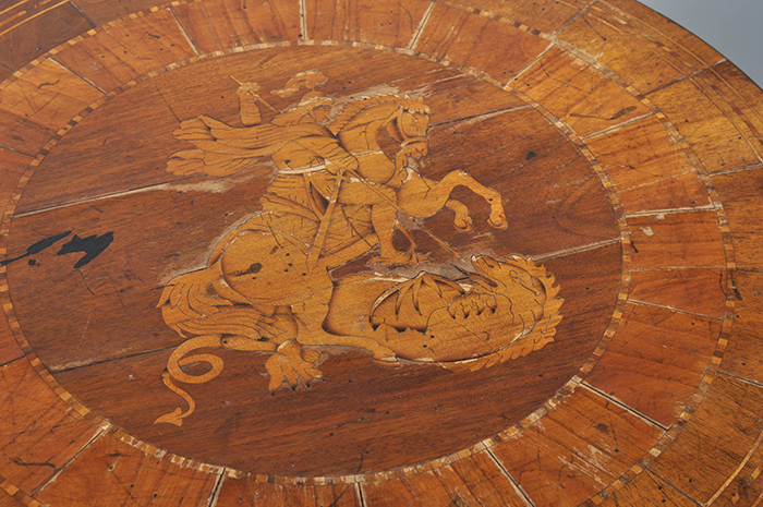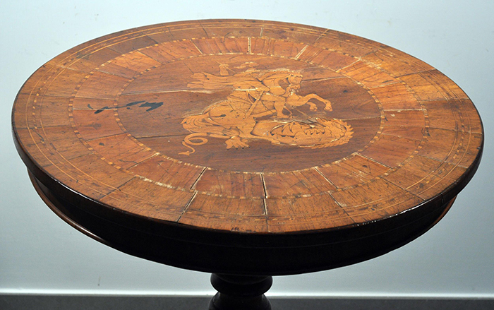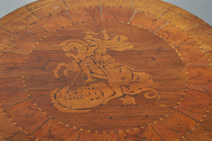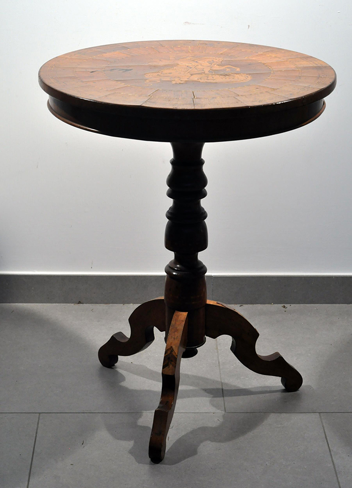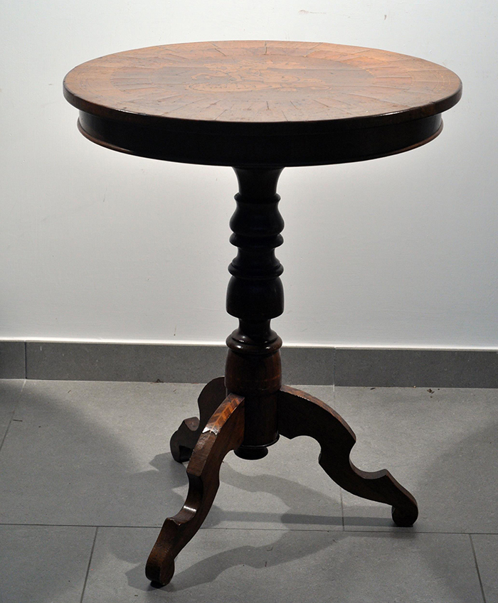 Coppia di tavolini tondi intarsiati in legno, fine '800. diam cm 60 h cm 75